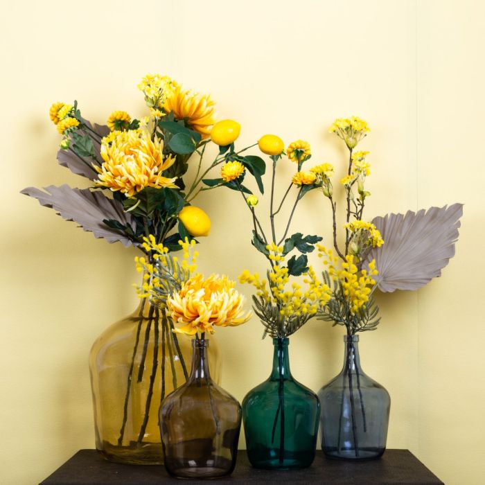 ... le possibilità sono infinite! Un ramo di limone come parte di un bouquet? Questo è possibile solo con artplants! Il nostro look è piuttosto giallo! Ed è quello che volevamo ottenere con questo look. Il giallo è il colore dell'allegria e della positività. Questo è anche l'effetto del nostro look, composto da crisantemi, mimose e fiori d'acero. Incorniciato da una fronda di palma, il colore rimane discretamente sullo sfondo e conferisce ai fiori ancora più luminosità. Le bottiglie a palloncino in vetro sono disponibili in così tanti colori che si abbinano a tutto! Acquistate il look!