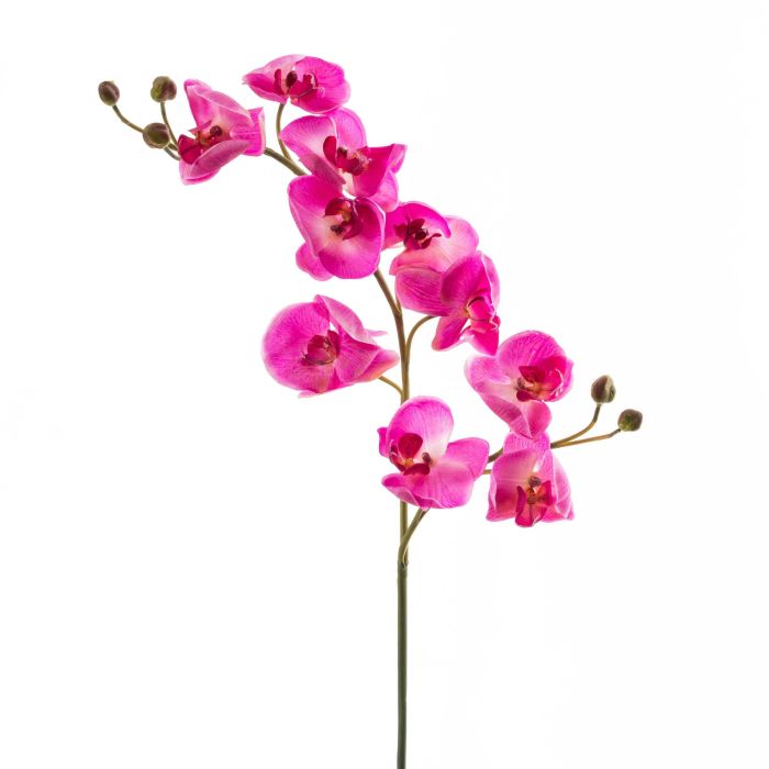 Ramo di orchidea Phalaenopsis decorativa con 10 fiori di colore fucsia e 5 germogli. Questo ramo artificiale misura ca. 90 cm in lunghezza.