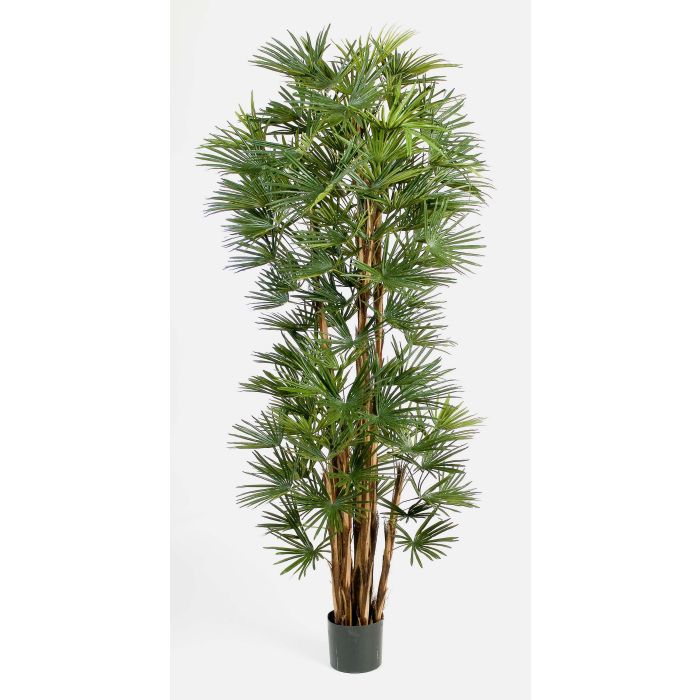 Palma Rhapis Excelsa artificiale composta da vari fusti. Questa palma decorativa ha un'altezza complessiva di ca. 180 cm.