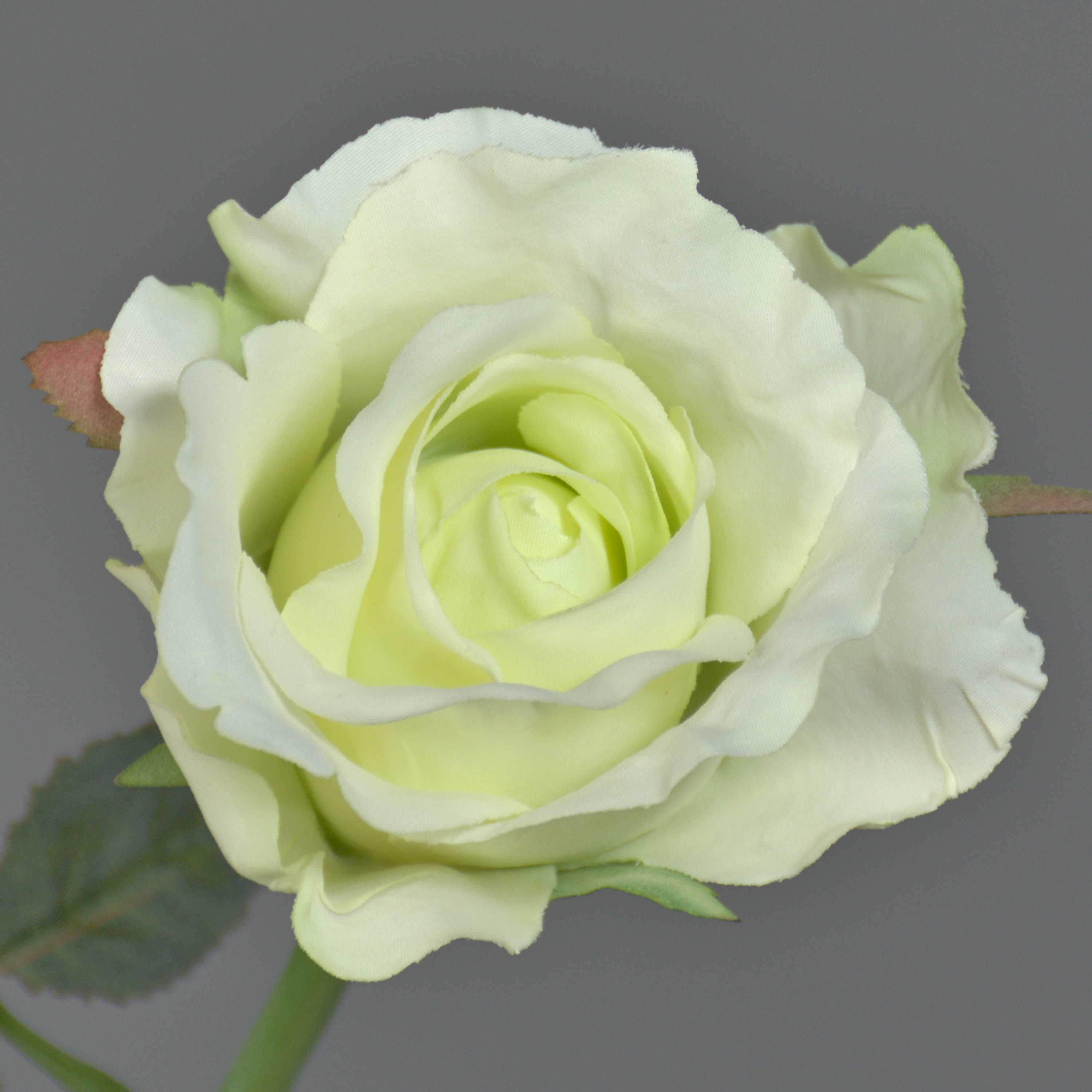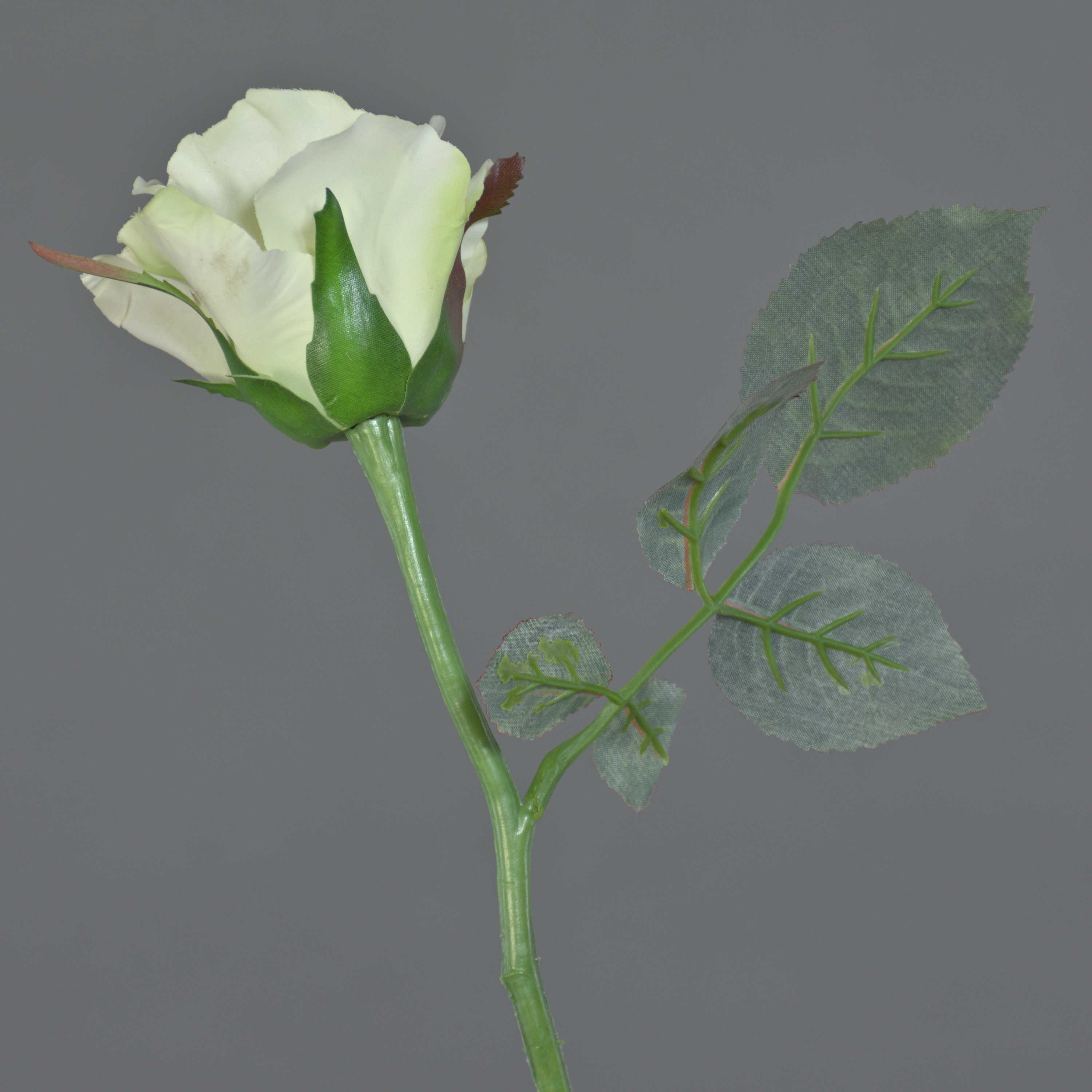 Graziosa rosa ELLI artificiale con fiore crema-bianco e foglie verdi in materiale tessile. La mini rosa decorativa ha una lunghezza complessiva di ca. 30 cm e il fiore ha un diametro di ca. 6 cm.
