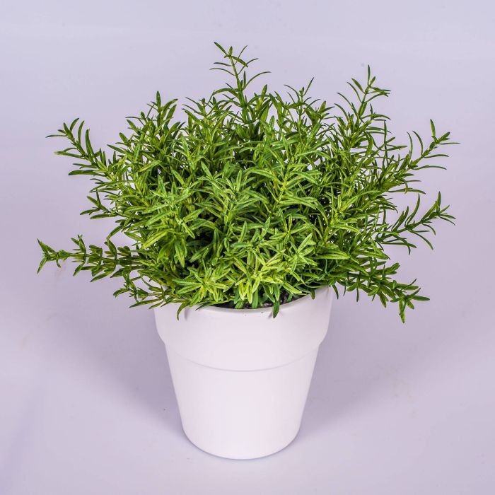 Arbusto di rosmarino consegnato in vaso di ceramica bianco. L'altezza è di circa 23 cm e con la sua linea semplice ed elegante è ottimo per decorare spazi domestici o locali pubblici.