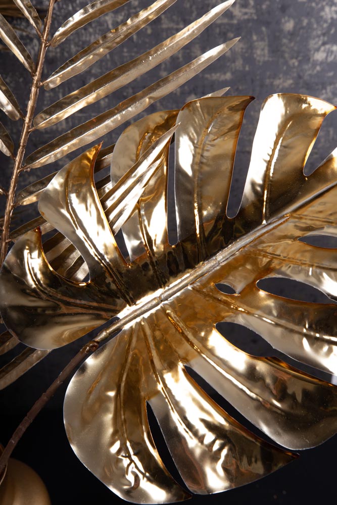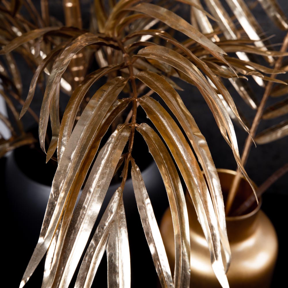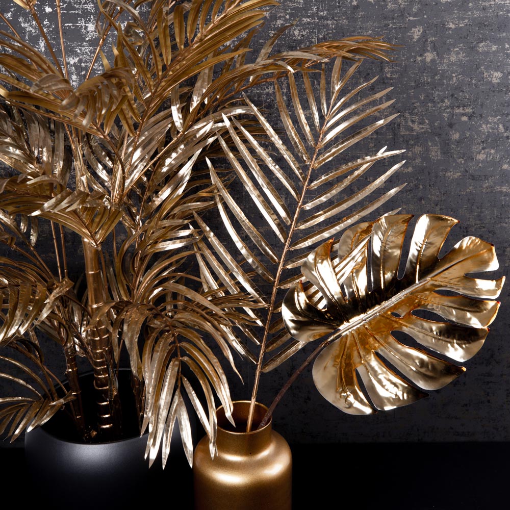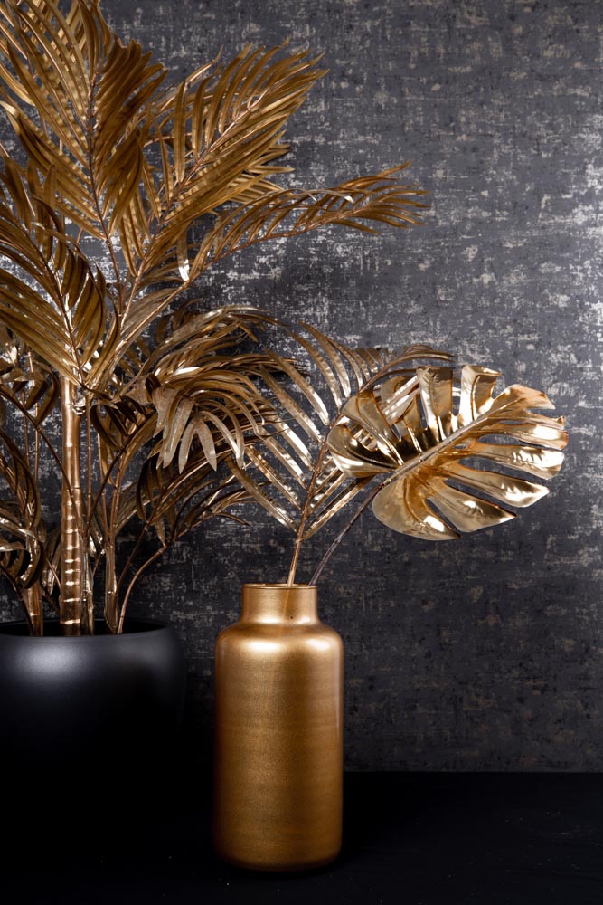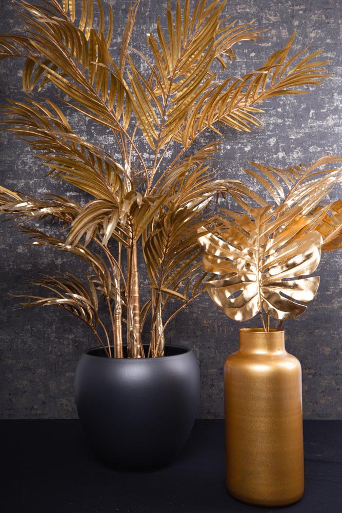 Nero e oro! La nostra varietà di piante finte dorate è di assoluta ispirazione! Per questo look, abbiamo optato per un design classico che si adatta davvero a qualsiasi salotto. Una palma in un vaso antracite abbinata a un vaso dorato, dotato di una foglia di filodendro e di una fronda di palma. Semplice, senza tempo e bellissimo! Acquista il look!