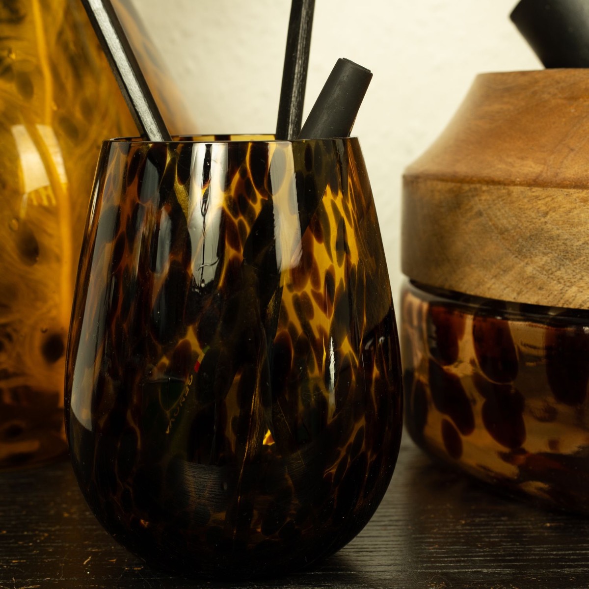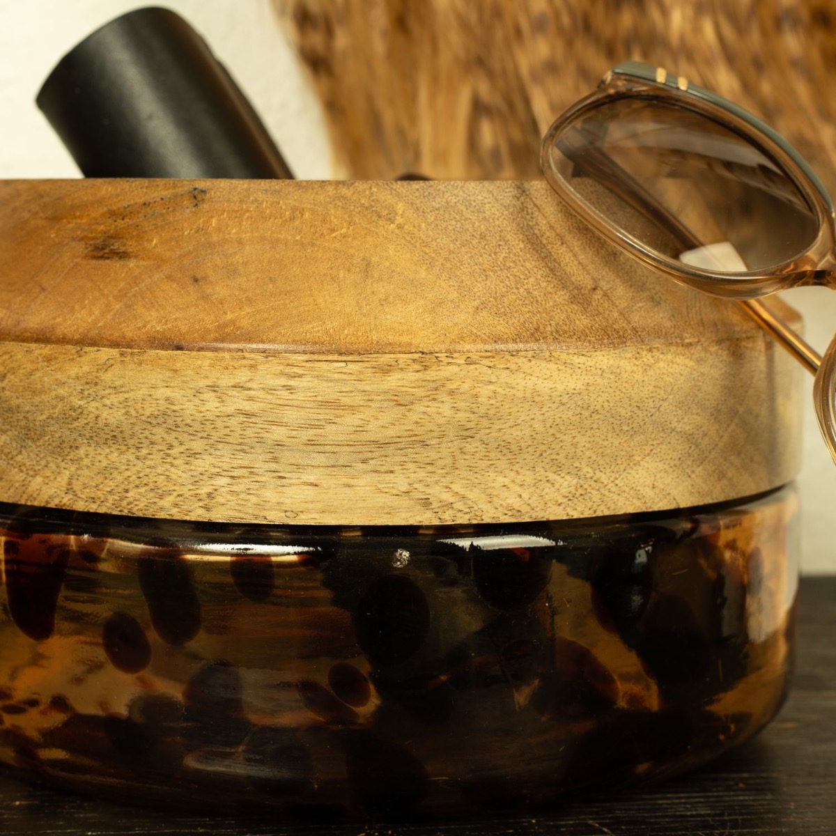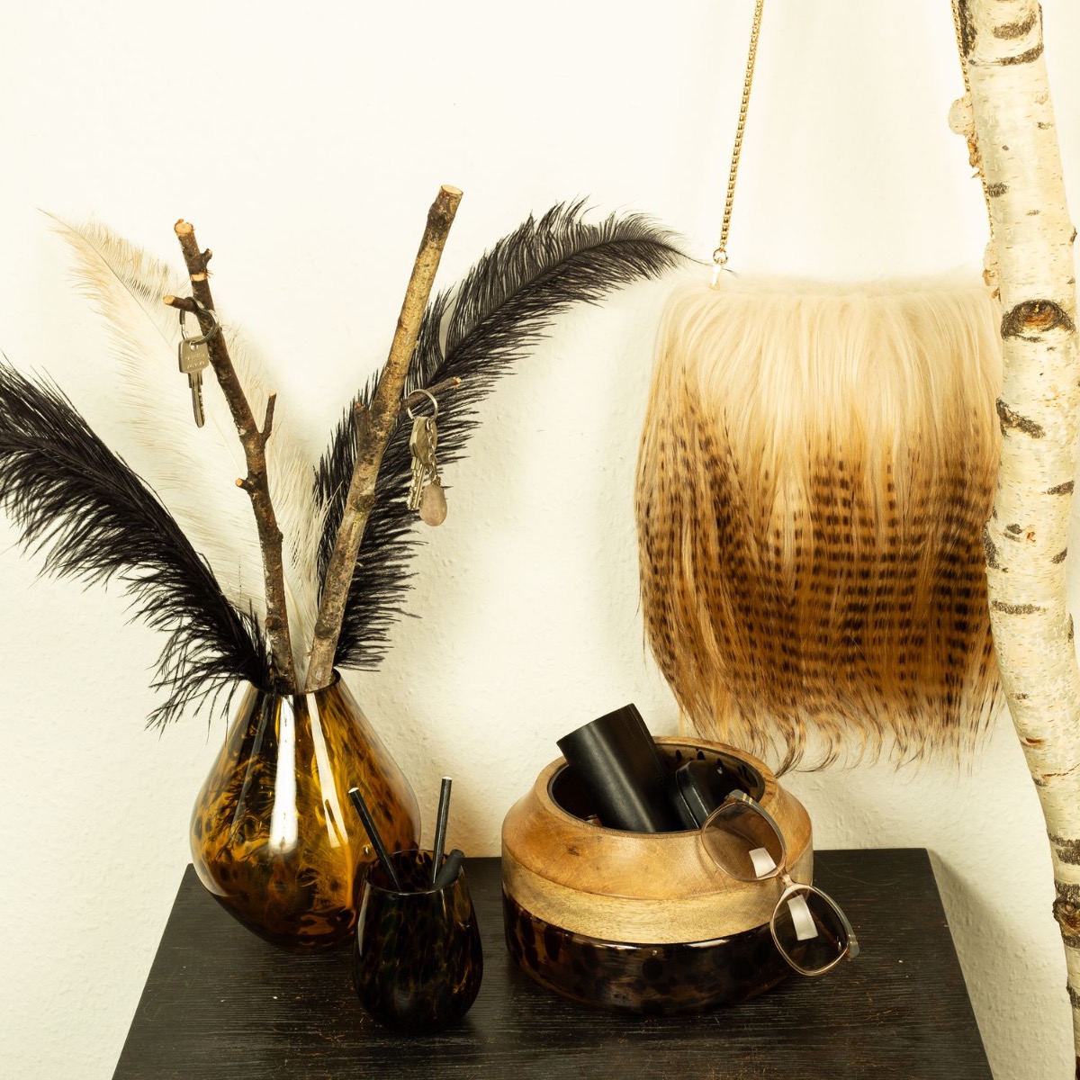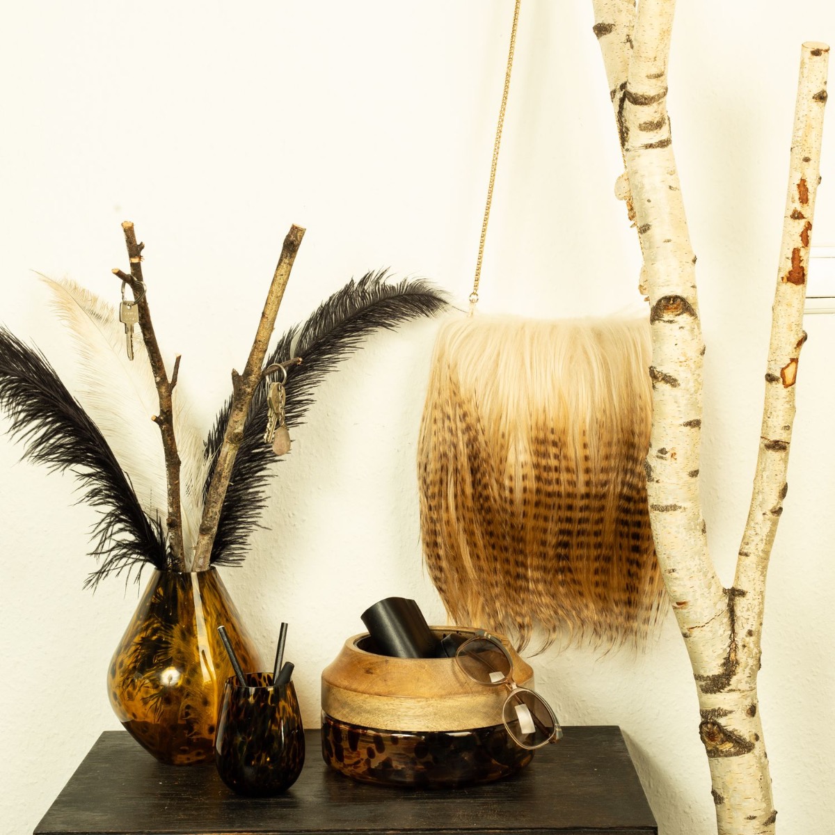 Stampa leone e piume! Con questo look mostriamo quanto siano versatili i nostri prodotti. I prodotti in vetro con stampa leopardata della serie RUSSELL sono stati completamente sprecati. Il vaso, con piume e betulla, funge da portapenne e la ciotola in vetro con bordo in vero legno è ideale per riporre occhiali da sole, portafogli e altro. La borsa in pelle è un must per tutti gli amanti degli animali. Acquista il look!