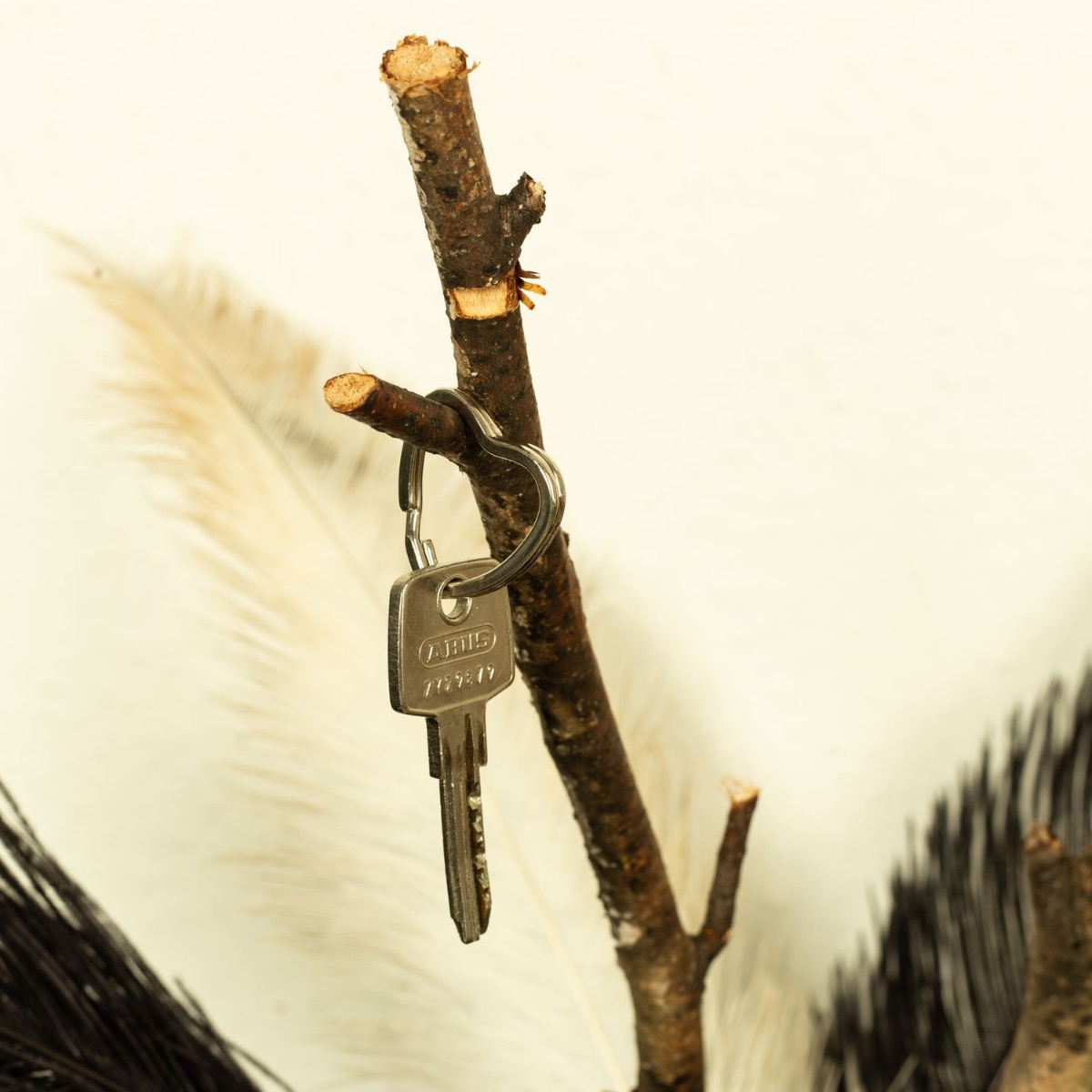 Suggerimento per il design: posiziona due piume nere e una bianca nel vaso e aggiungi 2-3 rami di betulla. Assicurati che i rami piccoli siano rivolti verso l'alto. Quindi puoi appenderci le chiavi. Pericolo! Per portachiavi più grandi, ti consigliamo di riempire il vaso con sabbia in modo che cada sotto il peso del pesante portachiavi.