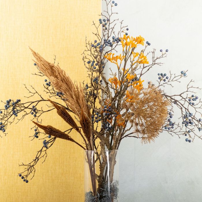 Colori della terra e tonalità del cielo! L'autunno può essere grigio e sporco, ma anche meraviglioso e colorato. I colori che la natura ha da offrire si rivelano particolarmente in autunno, con il cielo azzurro. Dal delicato beige dell'erba della pampa al rosso-marrone della bulbinella, il colore marrone ha incredibili sfaccettature. Il nostro fiore di canguro risplende nel suo ricco giallo zafferano tra i rami autunnali e dona un tocco di colore al look. Acquista il look!