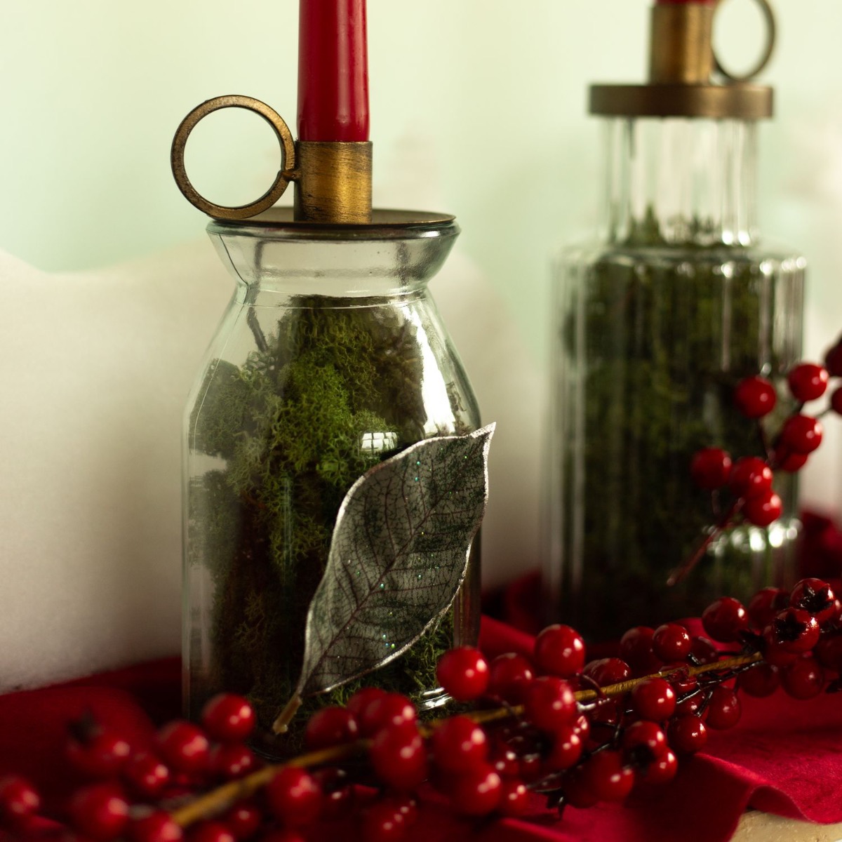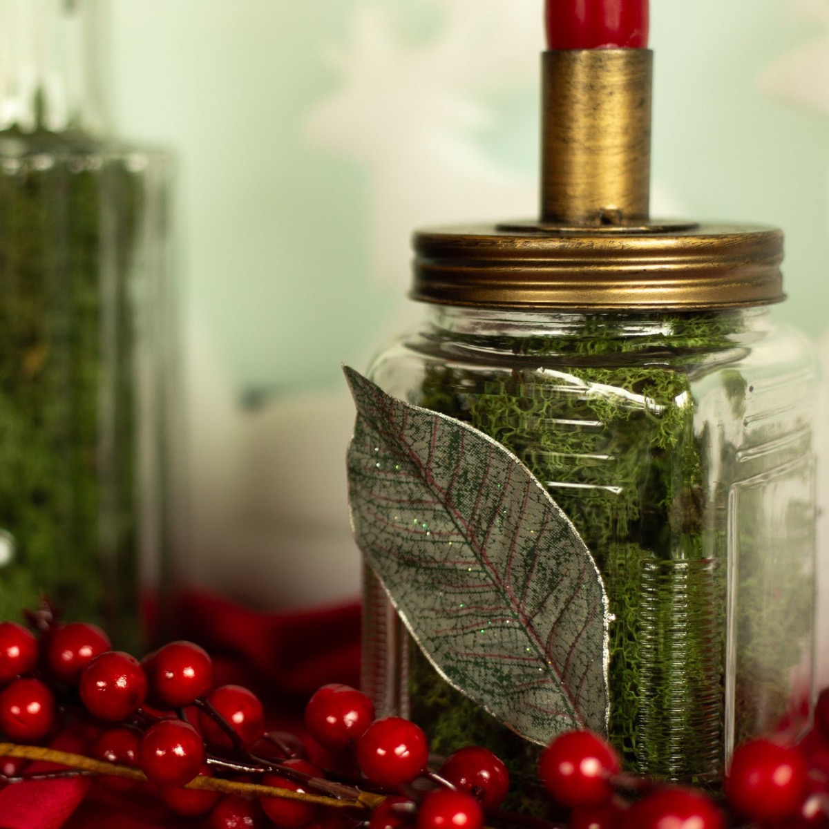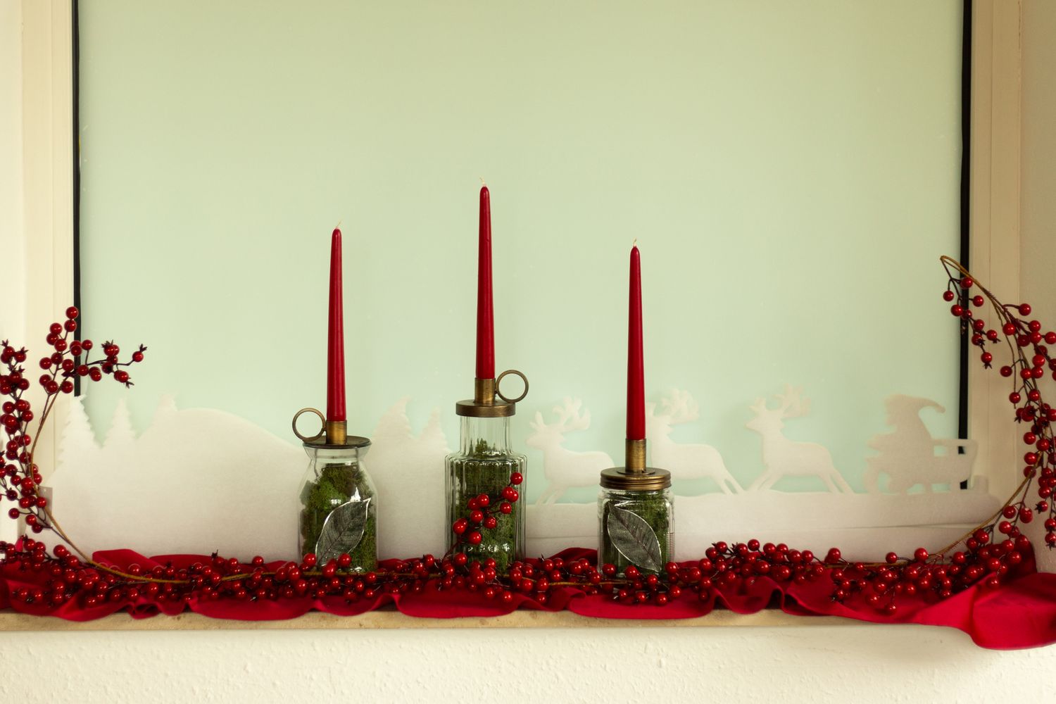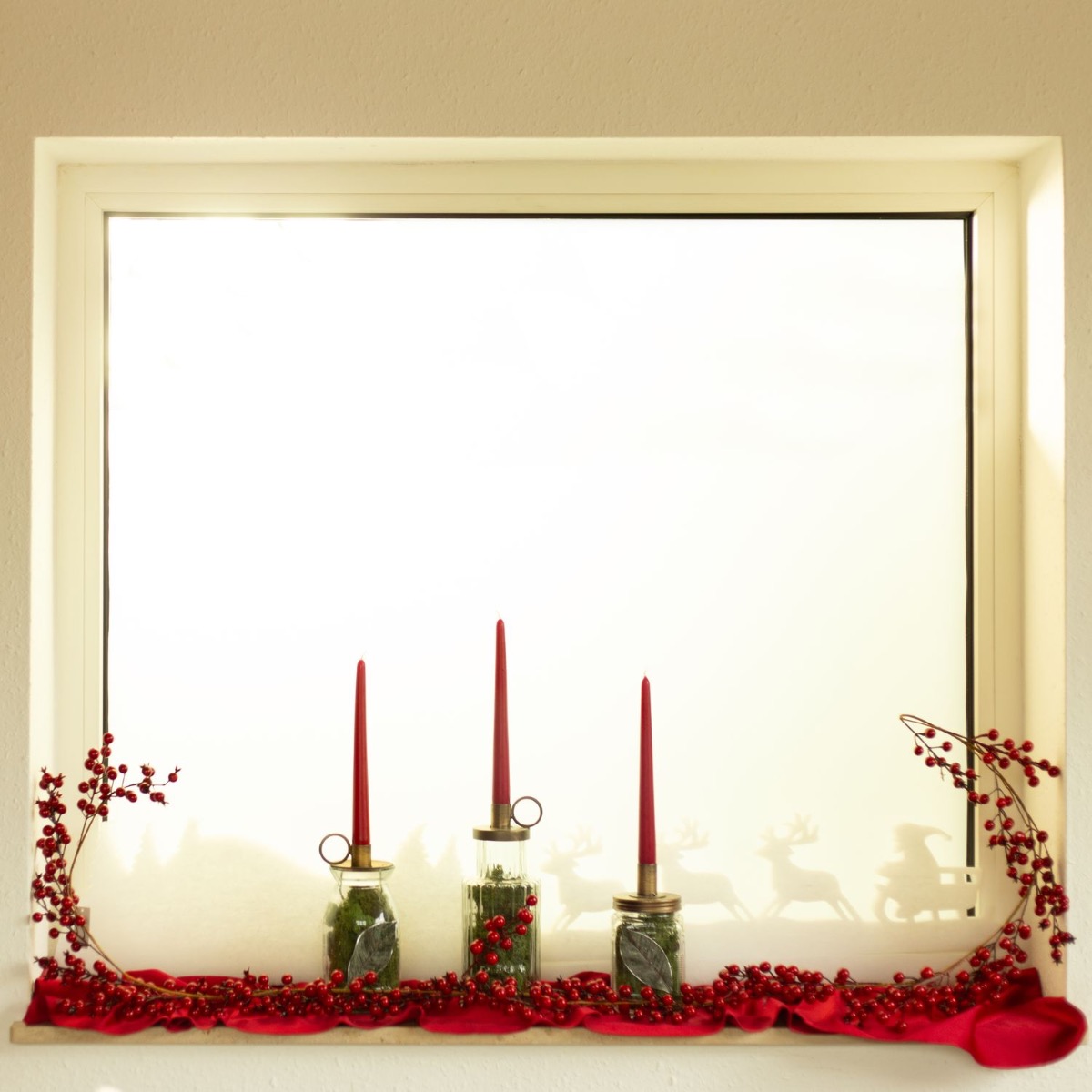 Consiglio per la decorazione: Riempite i vasi di muschio naturale e disponeteli in modo uniforme sul davanzale. Utilizzate il paesaggio invernale come sfondo. Abbiamo usato una pistola per colla a caldo per attaccare sui bicchieri le foglie e i pezzi caduti della ghirlanda di bacche. Questo completa il nostro look. La ghirlanda di bacche è in primo piano e incornicia il disegno.