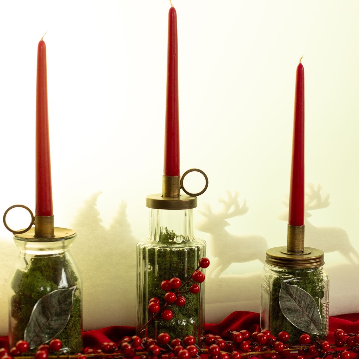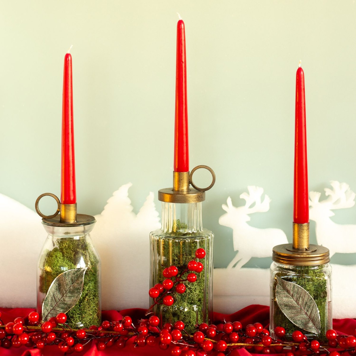 Roso, verde e dorato! Questo è Natale! Questo look natalizio è classico e moderno allo stesso tempo. I portacandele, riempiti di muschio verde naturale, sono assolutamente di tendenza con il loro design vintage e si abbinano molto bene alle candele a bastoncino rosse. La ghirlanda di bacche rosse e il paesaggio invernale bianco sullo sfondo evocano un'atmosfera natalizia nella vostra casa. Questo look funziona particolarmente bene su un davanzale perché la luce che entra dall'esterno fa risplendere il paesaggio invernale. Acquistate il look!