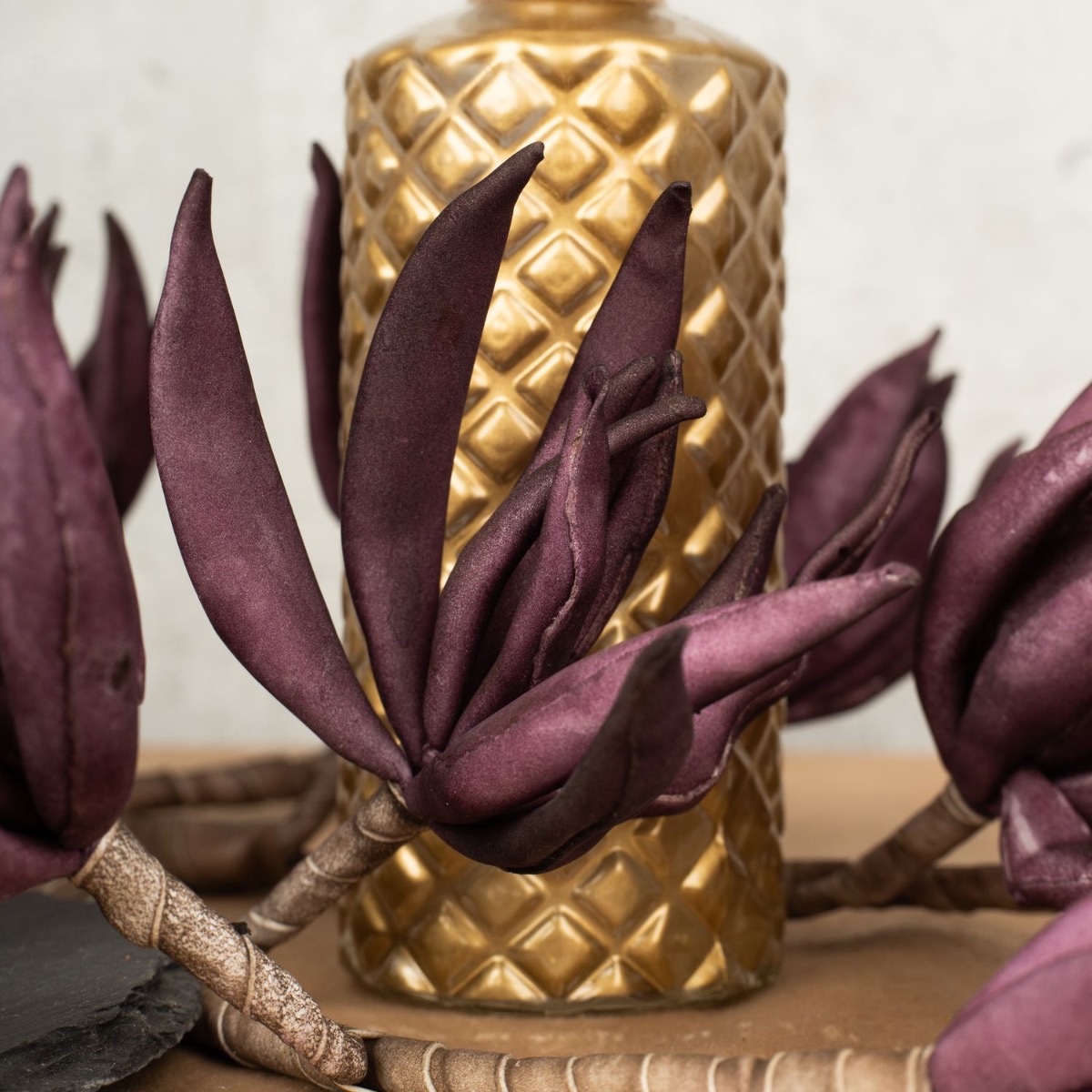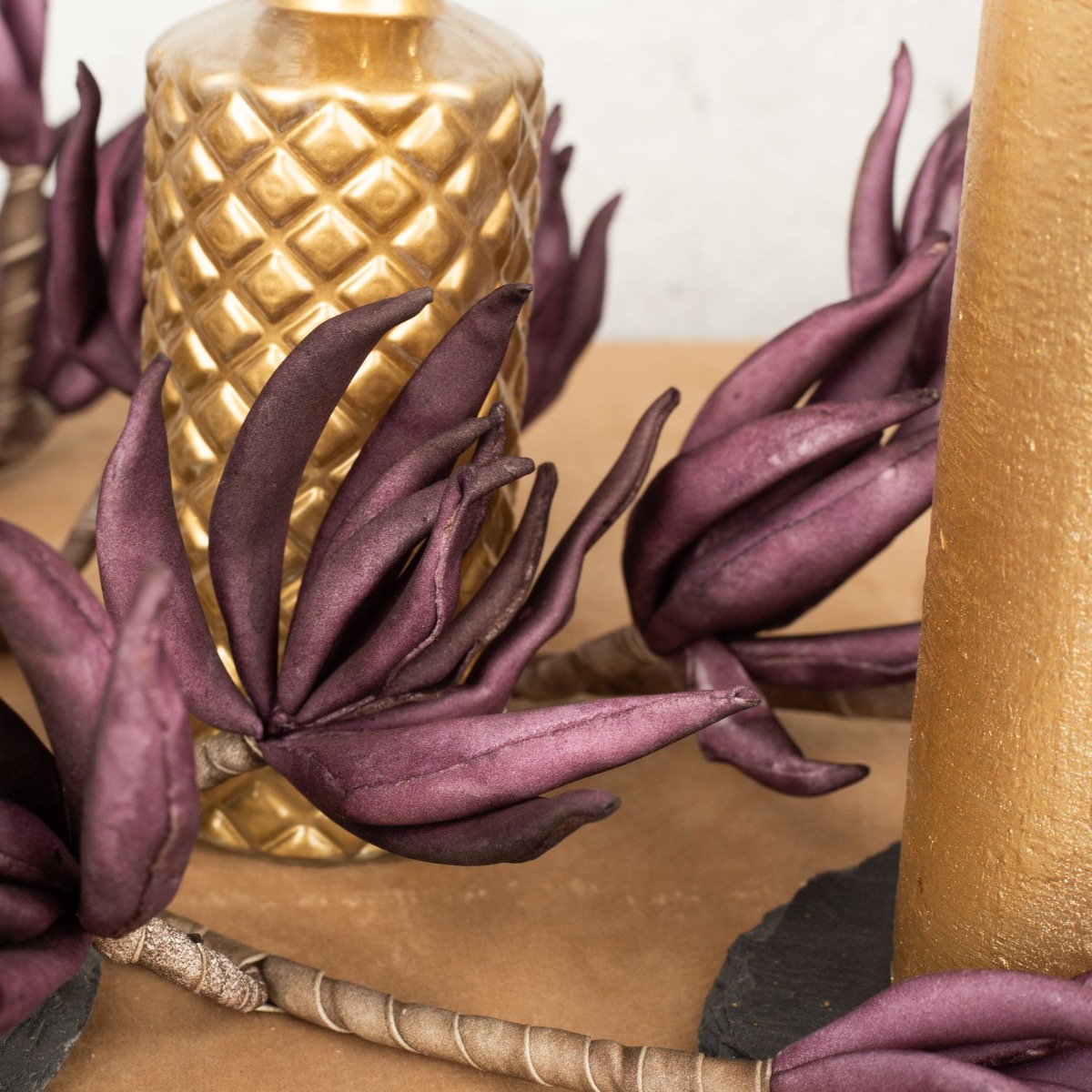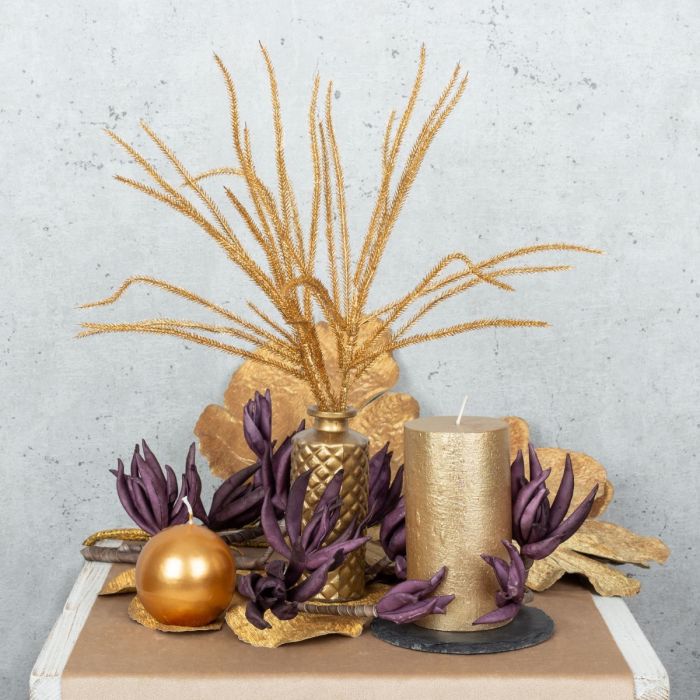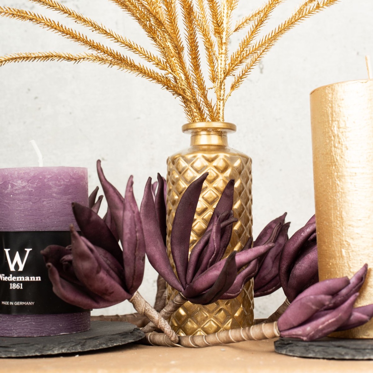 Viola e oro! Una combinazione di colori suggestiva che si sposa particolarmente bene in inverno. Quando fuori fa freddo, si vuole portare il calore in casa. Le calde tonalità dell'oro sono particolarmente adatte in questo caso, in quanto creano anche un'atmosfera festosa per l'imminente stagione natalizia. I fiori artificiali di colore viola spiccano tra le decorazioni per la tavola e giocano con gli elementi dorati sul tavolo. Incantate i vostri ospiti con questa splendida decorazione. Acquista il look!