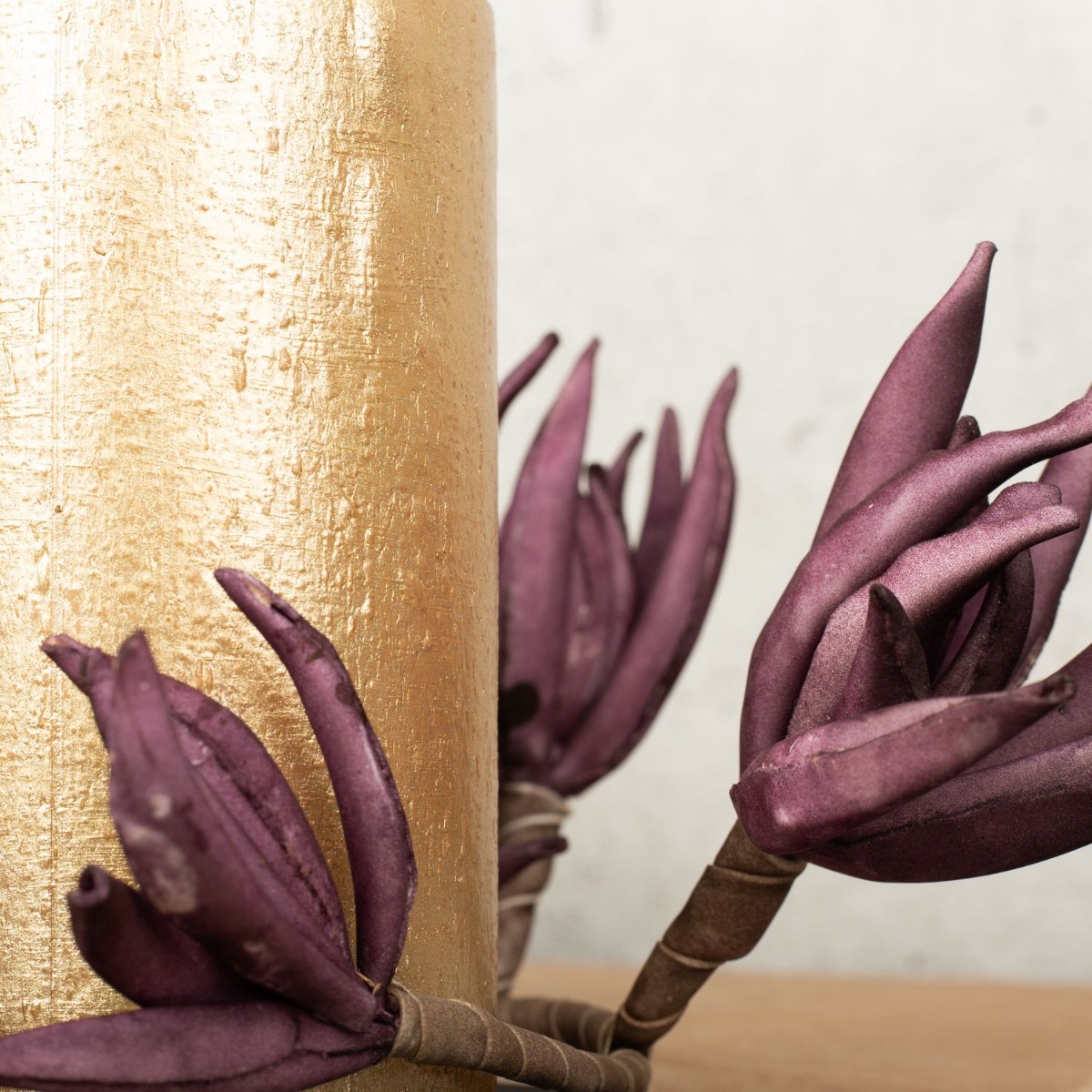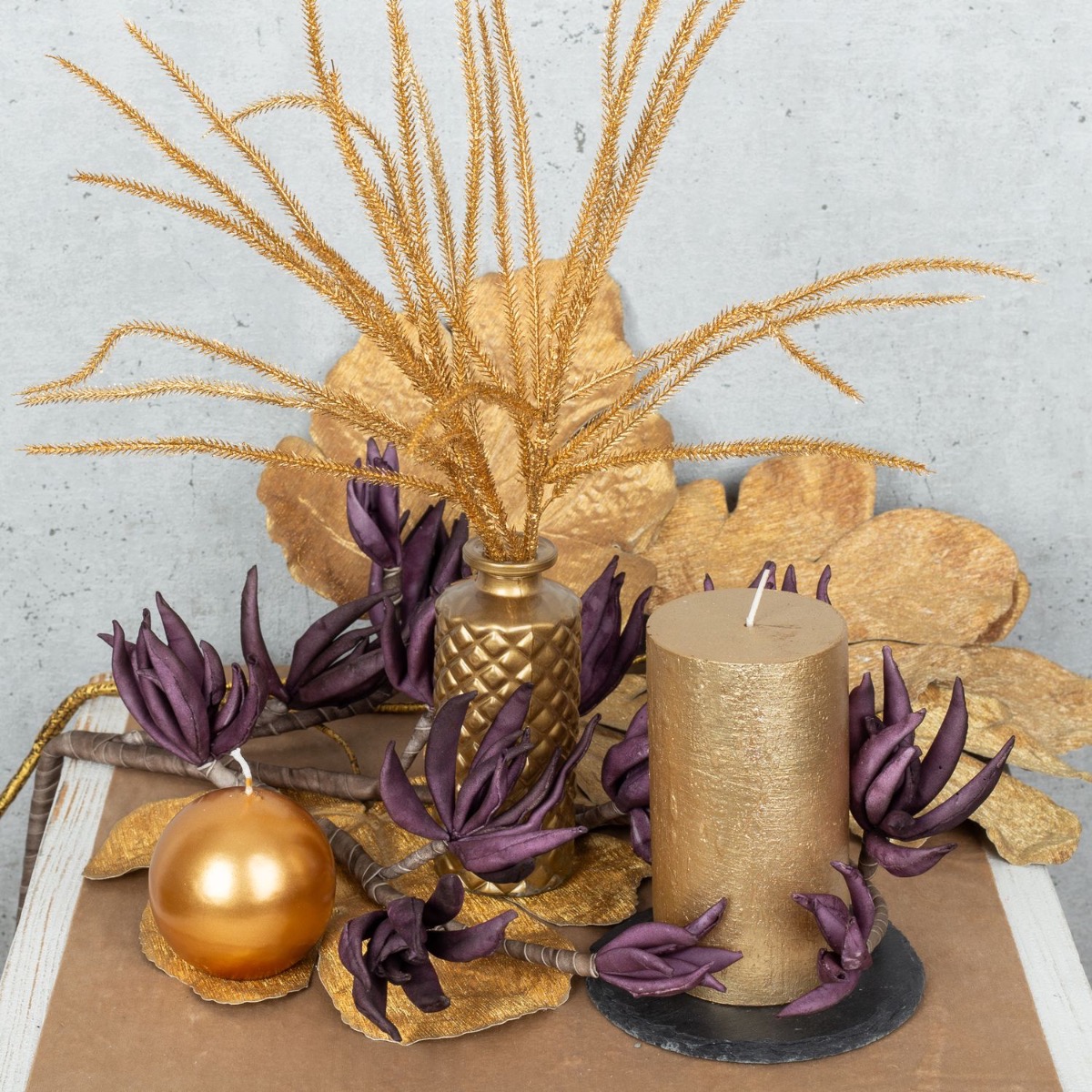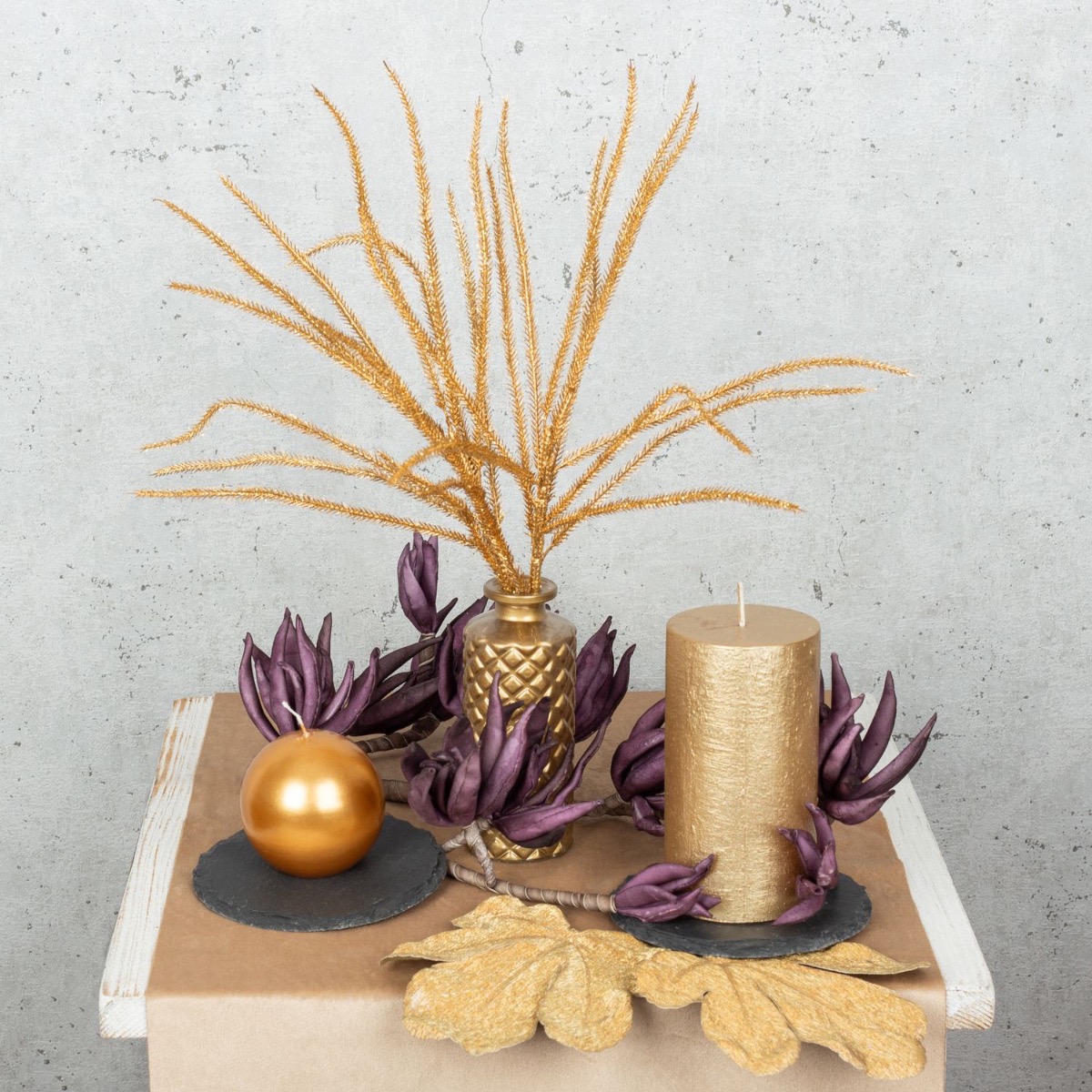 Consiglio di design: La foglia di fico dorata è stata posizionata per prima sul tavolo. Alcune foglie servono come base per candele e vasi. È anche possibile rimuovere le foglie dal gambo, per facilitare il design. Il rametto di fiori artificiali viola è appoggiato sul tavolo e i fiori sono piegati verso l'alto. È possibile tagliare semplicemente lo stelo o piegarlo intorno agli elementi decorativi.