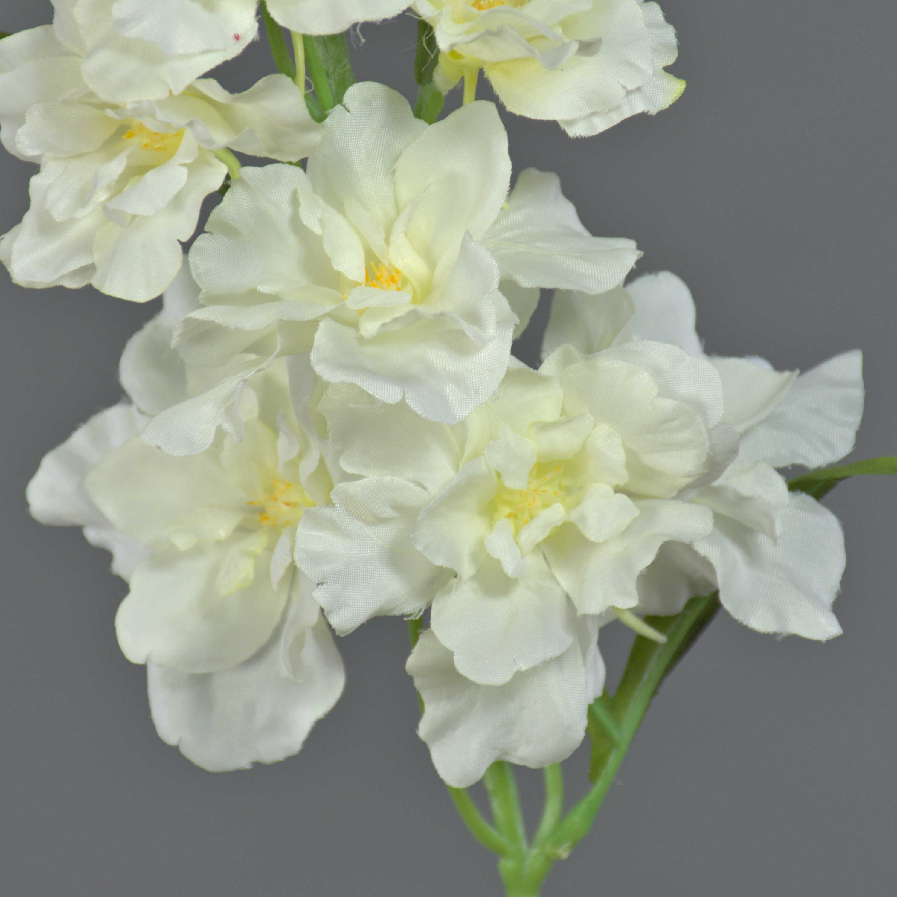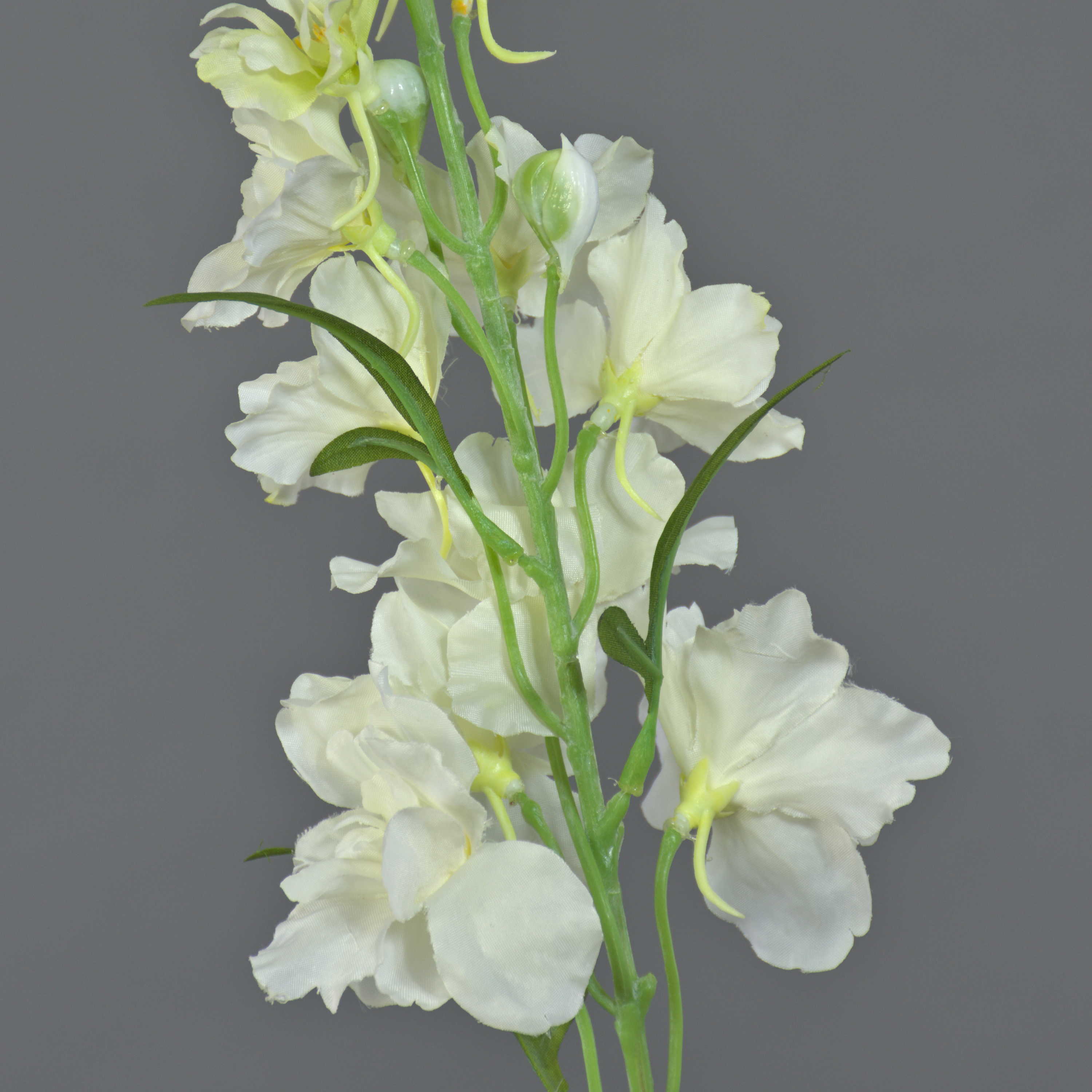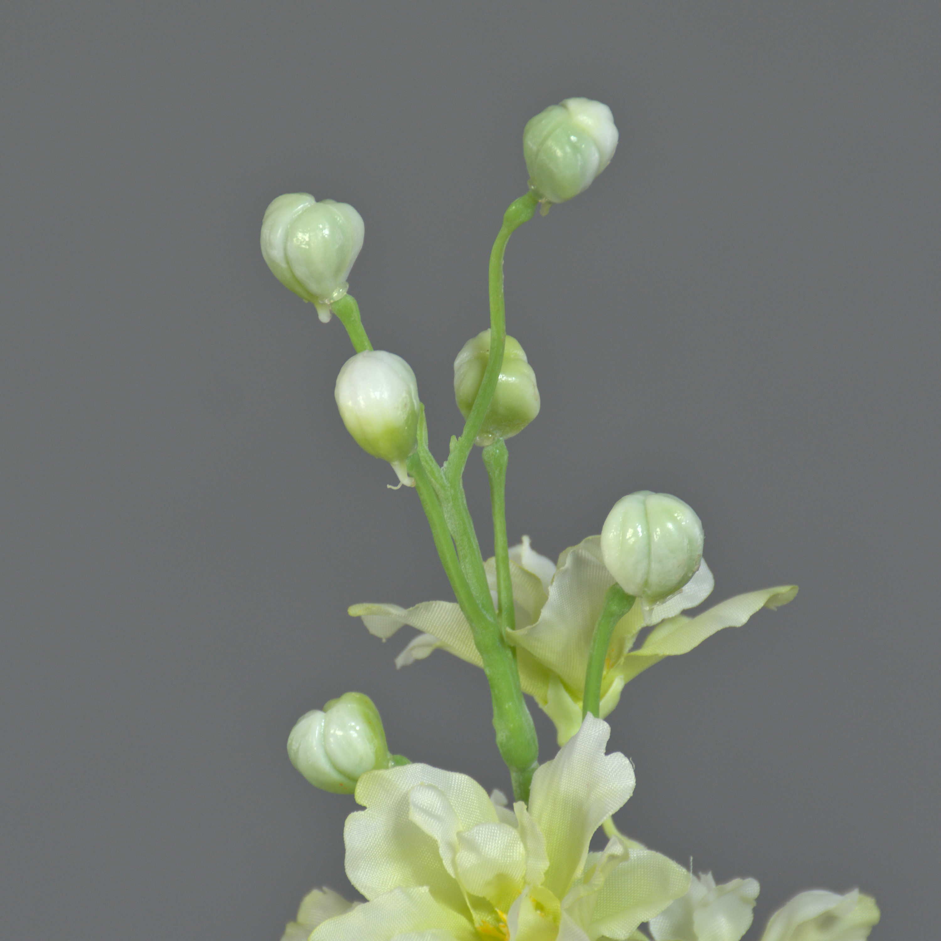 La speronella artificiale RASMINE di colore bianco-giallo ha una lunghezza totale di ca. 60 cm e un diametro del fiore di ca. 5-7 cm.