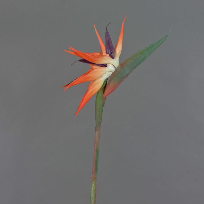 Grazioso fiore di Strelizia (o Strelitzia o Uccello del Paradiso) artificiale di colore arancione intenso. Questo fiore decorativo tropicale lungo ca. 95 cm.