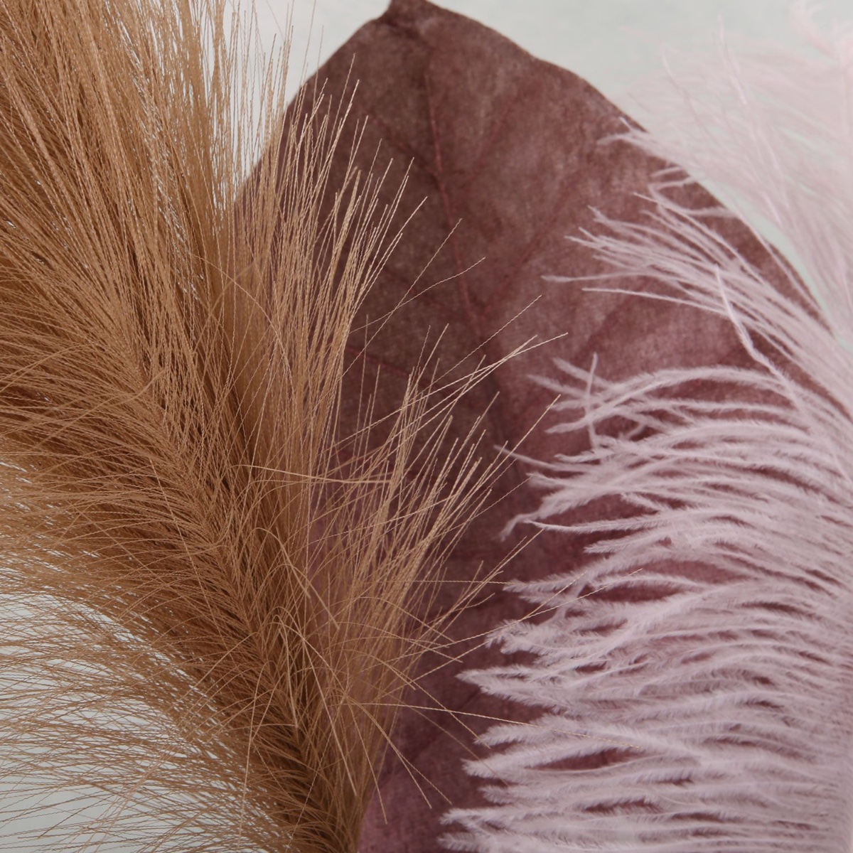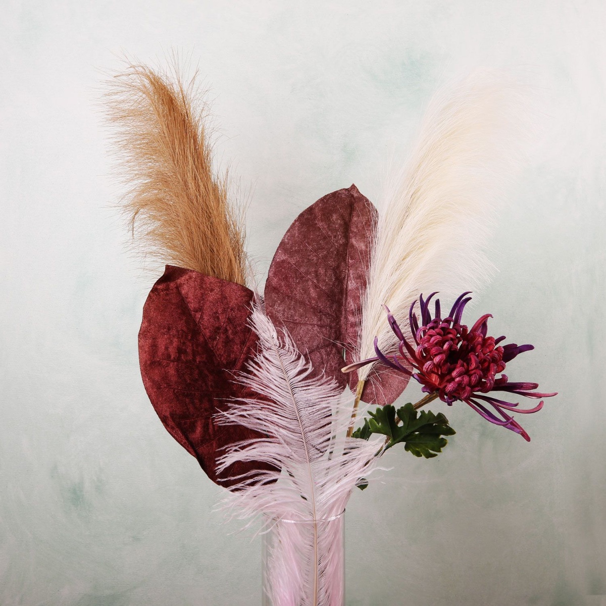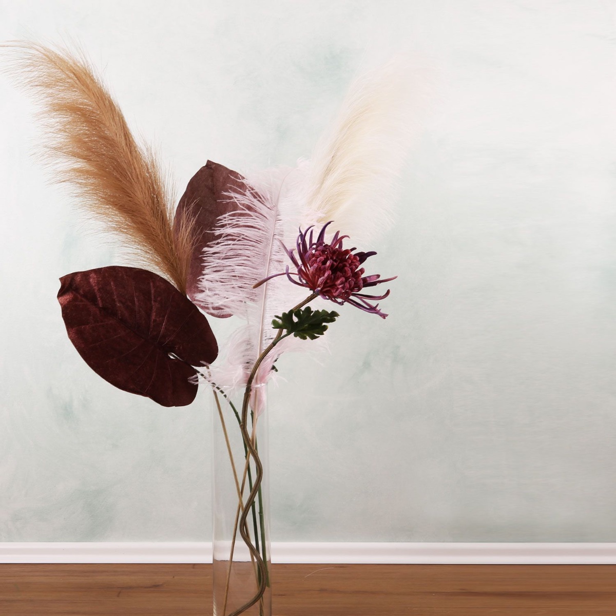 Pelliccia e velluto! L'estate è finalmente finita e le giornate buie stanno cambiando il nostro umore. Le serate a casa si rallegrano con una tazza di tè o di cioccolata calda e si osservano le foglie d'autunno cadere. Questo look autunnale crea un'atmosfera accogliente nel vostro salotto. Foglie vellutate, erba stipa e vere piume di struzzo sono così morbide che viene voglia di accoccolarsi accanto a loro. Ma un crisantemo viola vi fermerà. Acquista il look!