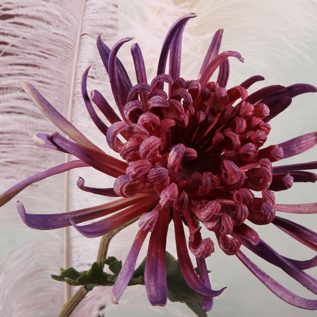 Suggerimento per il design: Piegare il gambo del crisantemo a spirale per adattarlo al vaso. Piegare le foglie leggermente verso l'esterno. Posizionare la piuma e l'erba stipa in questo modo.