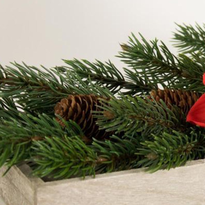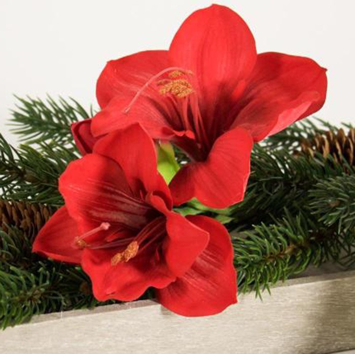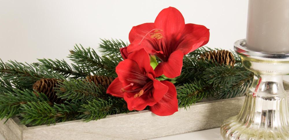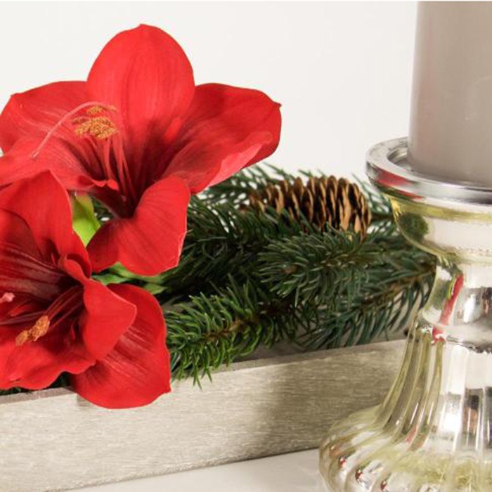 Rosso e accogliente! Una decorazione dell'Avvento molto semplice ma elegante. Il pezzo forte è sicuramente il grande amaryllis, che risplende nel classico rosso e crea un'atmosfera calda a lume di candela la sera. Un ramo di abete decorato con bacche e pigne completa perfettamente questo look. Vi è venuta voglia di un po' di spirito d'Avvento? Acquista il look!