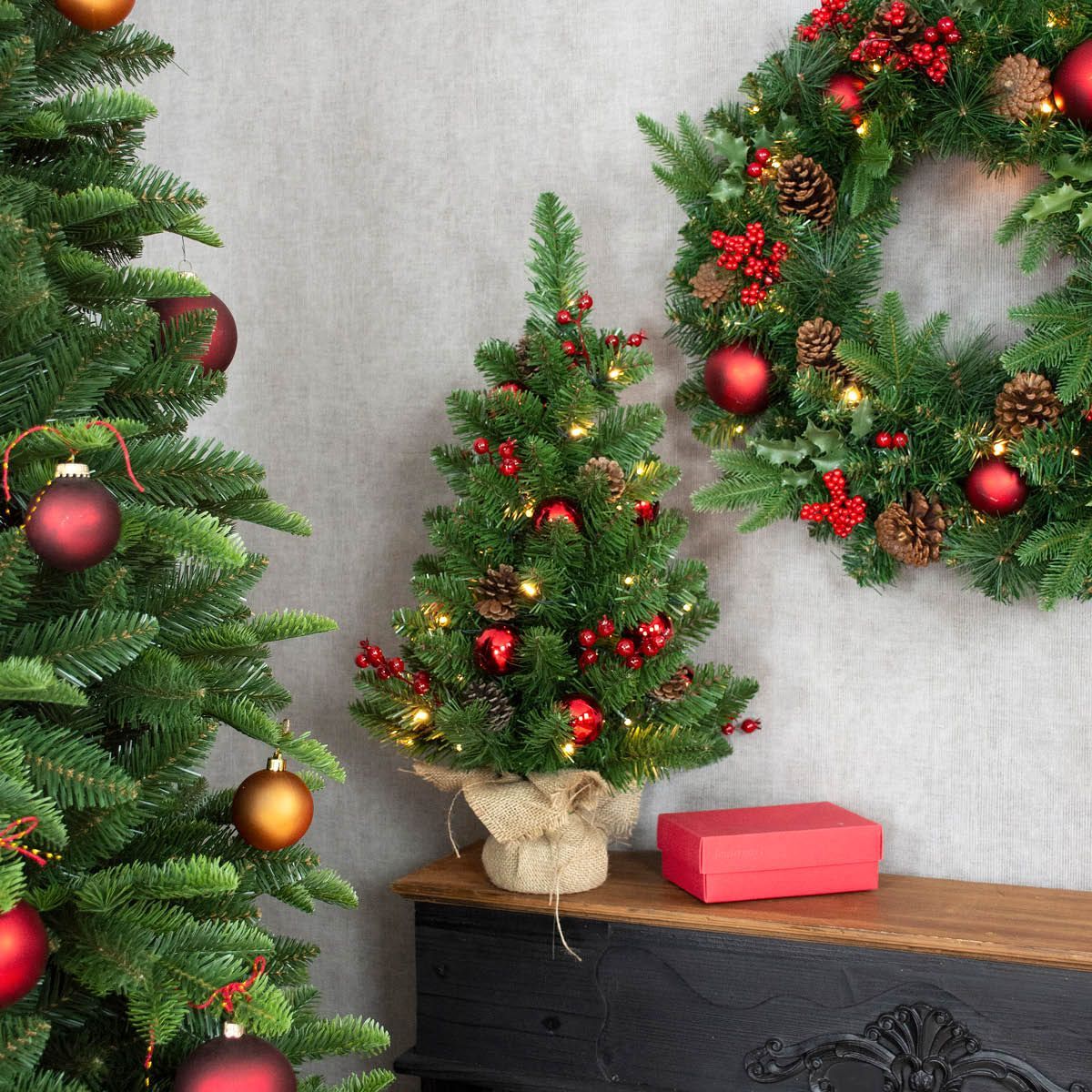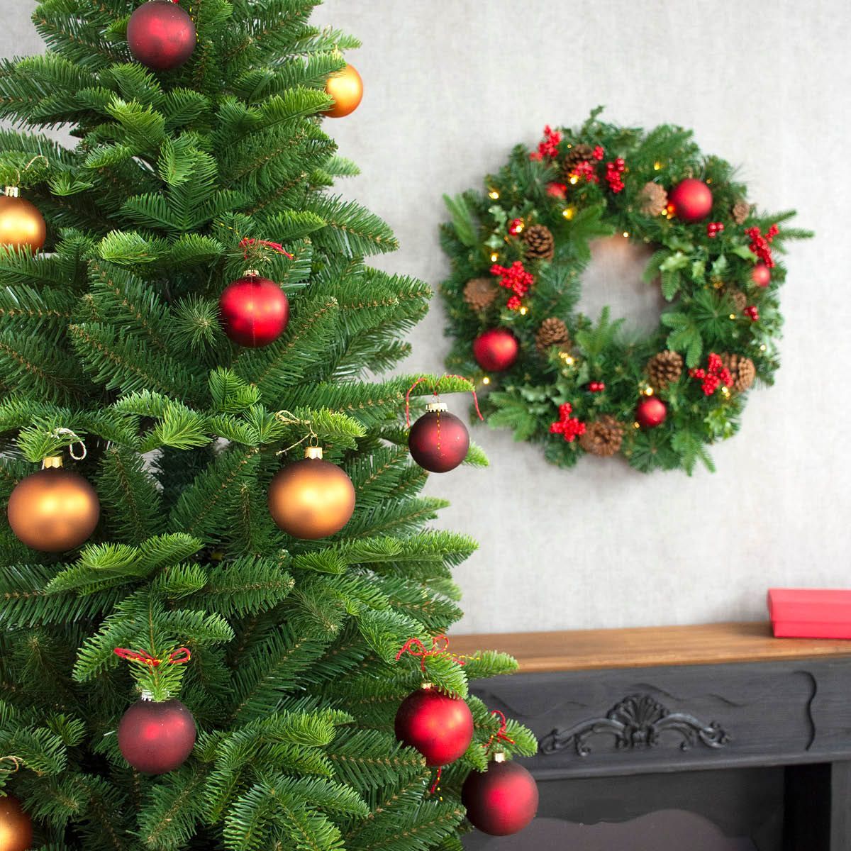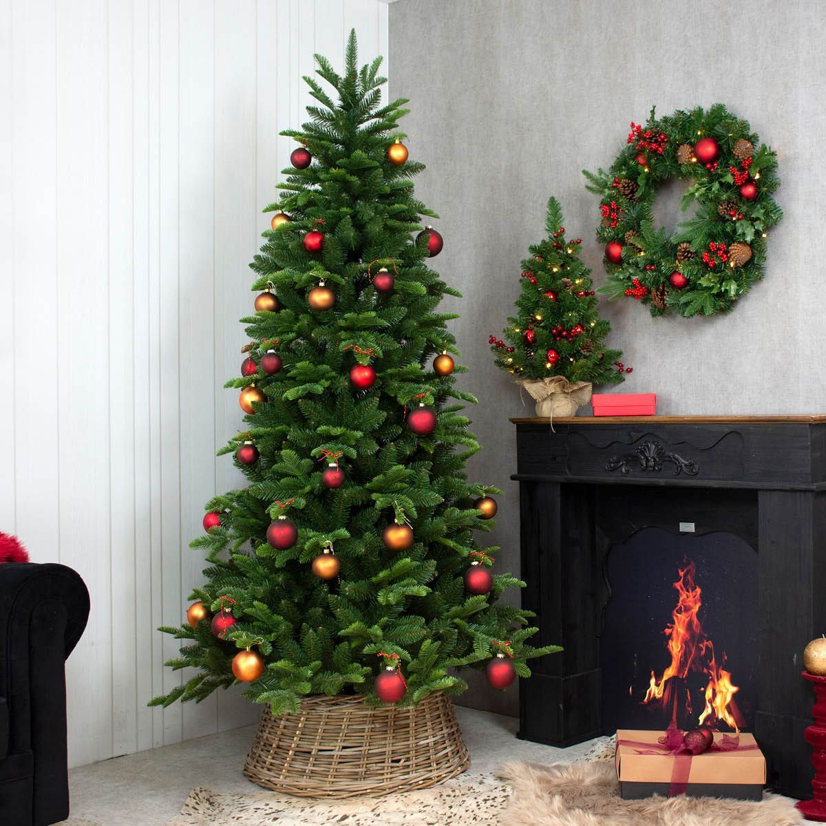 Palline rosse, sogni dorati: il Natale inizia qui! Immagina una stanza natalizia che trasmette immediatamente calore e magia festiva: un rigoglioso albero di Natale adorna l'angolo, decorato con cura con palline dorate e rosse opache che riflettono delicatamente la luce e creano un gioco di colori scintillante. L'albero poggia su un cesto natalizio in rattan naturale, che non solo gli conferisce stabilità, ma dona alla stanza un tocco rustico ed elegante. Lo sguardo si sposta poi sulla mensola del camino: un piccolo albero di Natale decorativo è pronto a completare perfettamente il grande albero, mentre una ghirlanda di abete sopra il camino incornicia festosamente la stanza. Pigne, palline rosse, lucine scintillanti e delicati rami di bacche conferiscono a entrambe le decorazioni un fascino artigianale e amorevole. Ogni sguardo al caminetto racconta una piccola storia di Natale che invoglia a godersi il momento con la famiglia e gli amici. Questo ensemble è più di una semplice decorazione: è un'esperienza classica, elegante e accogliente, un look che trasforma ogni casa in un caldo mondo natalizio. Perfetto per chi desidera combinare stile, tradizione e atmosfera accogliente. Acquista il look!