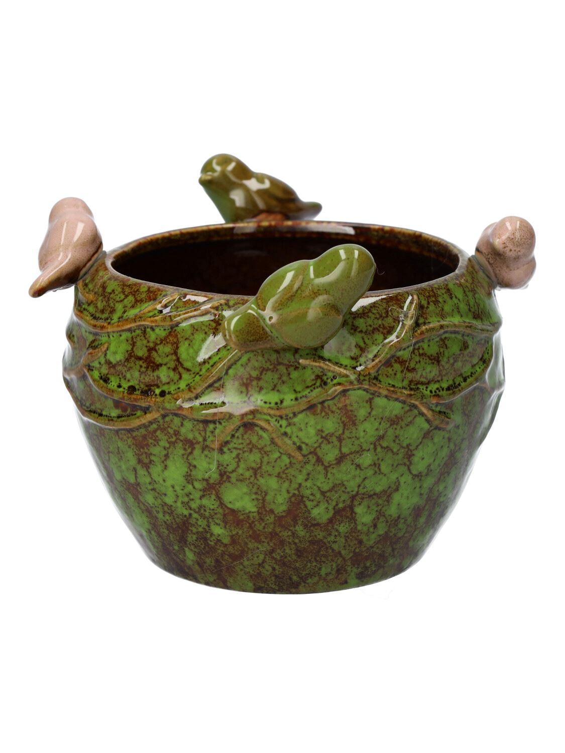 Vaso rotondo SARINO in ceramica, con uccelli 3D, verde-marrone-beige, 10,5 cm, Ø 14 cm