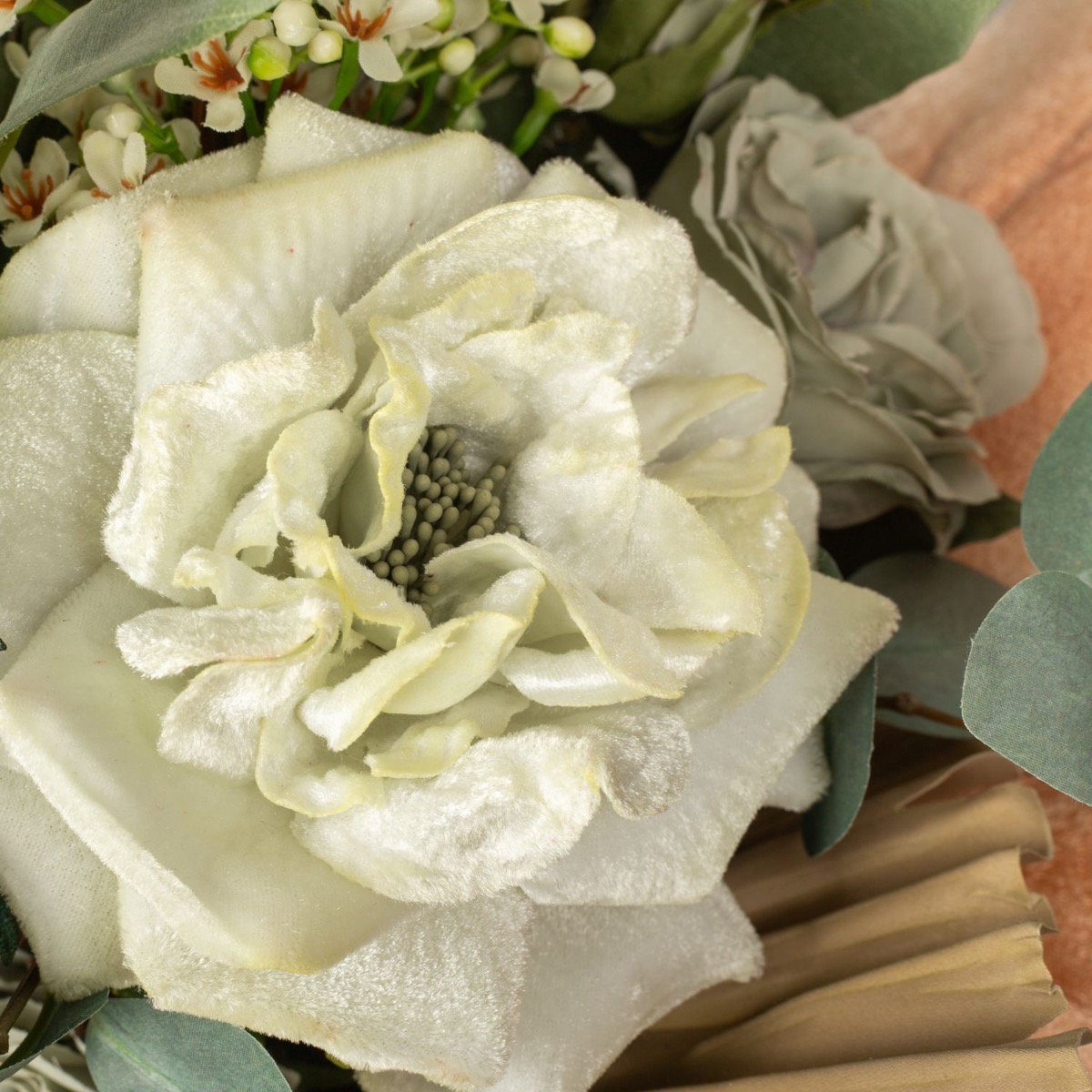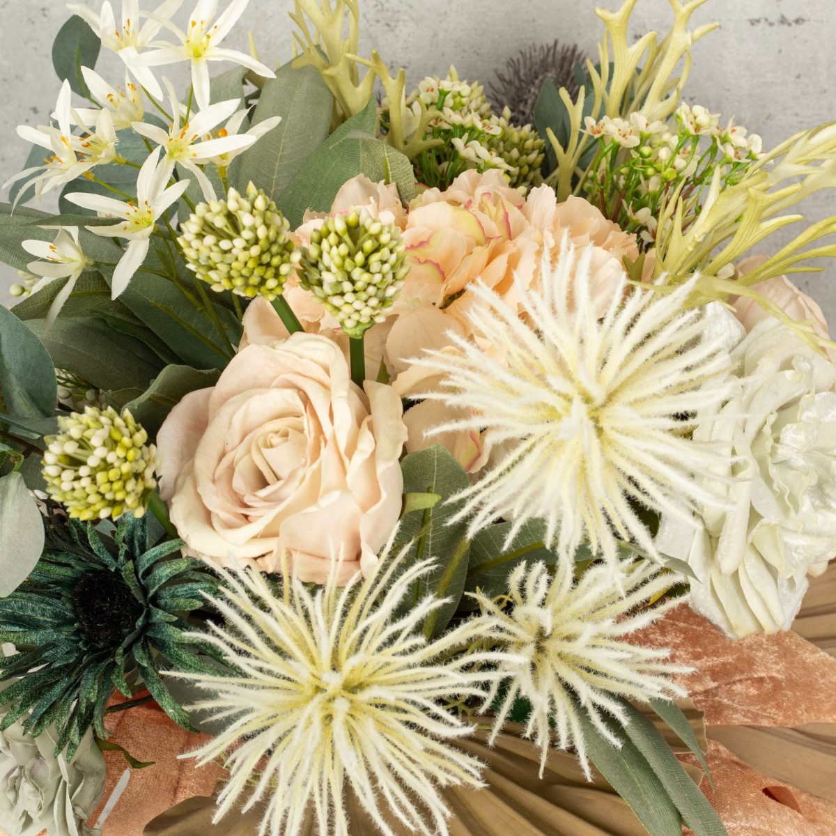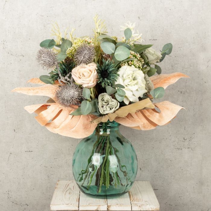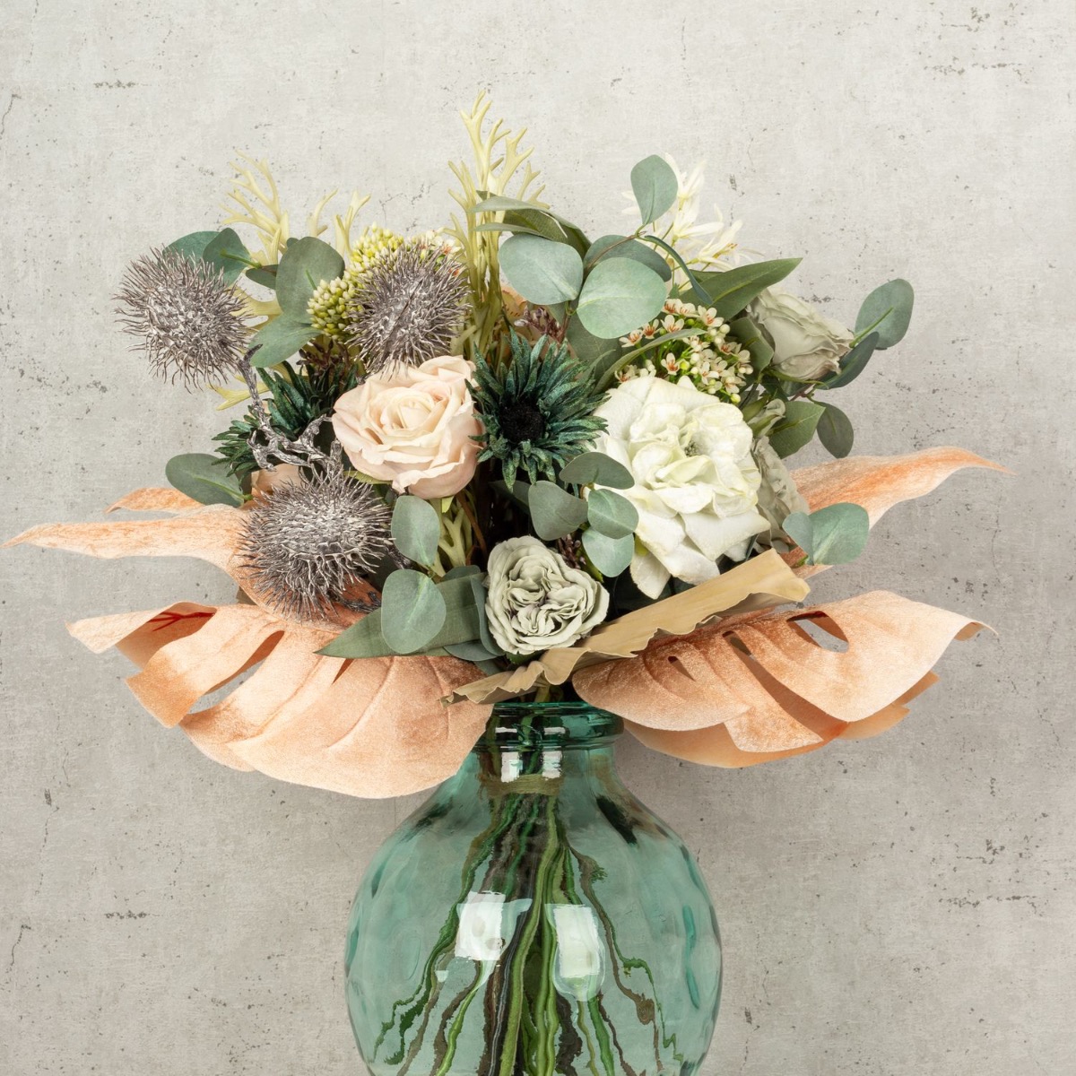 Rosa e verde eucalipto! Questo bouquet da sogno è un vero e proprio colpo d'occhio. Le delicate rose, i vellutati crisantemi e il pungente rambutan sono incorniciati dalle vellutate foglie. Non vi stancherete di guardarli perché questo bouquet appare diverso da ogni angolazione, dato che abbiamo utilizzato molti fiori diversi. Una festa per gli occhi! Acquista il look!