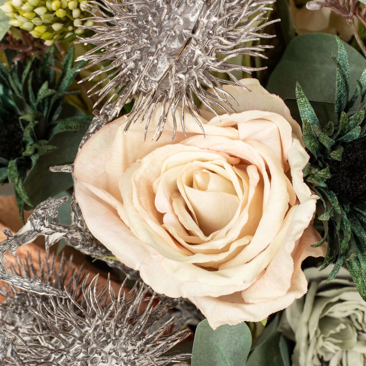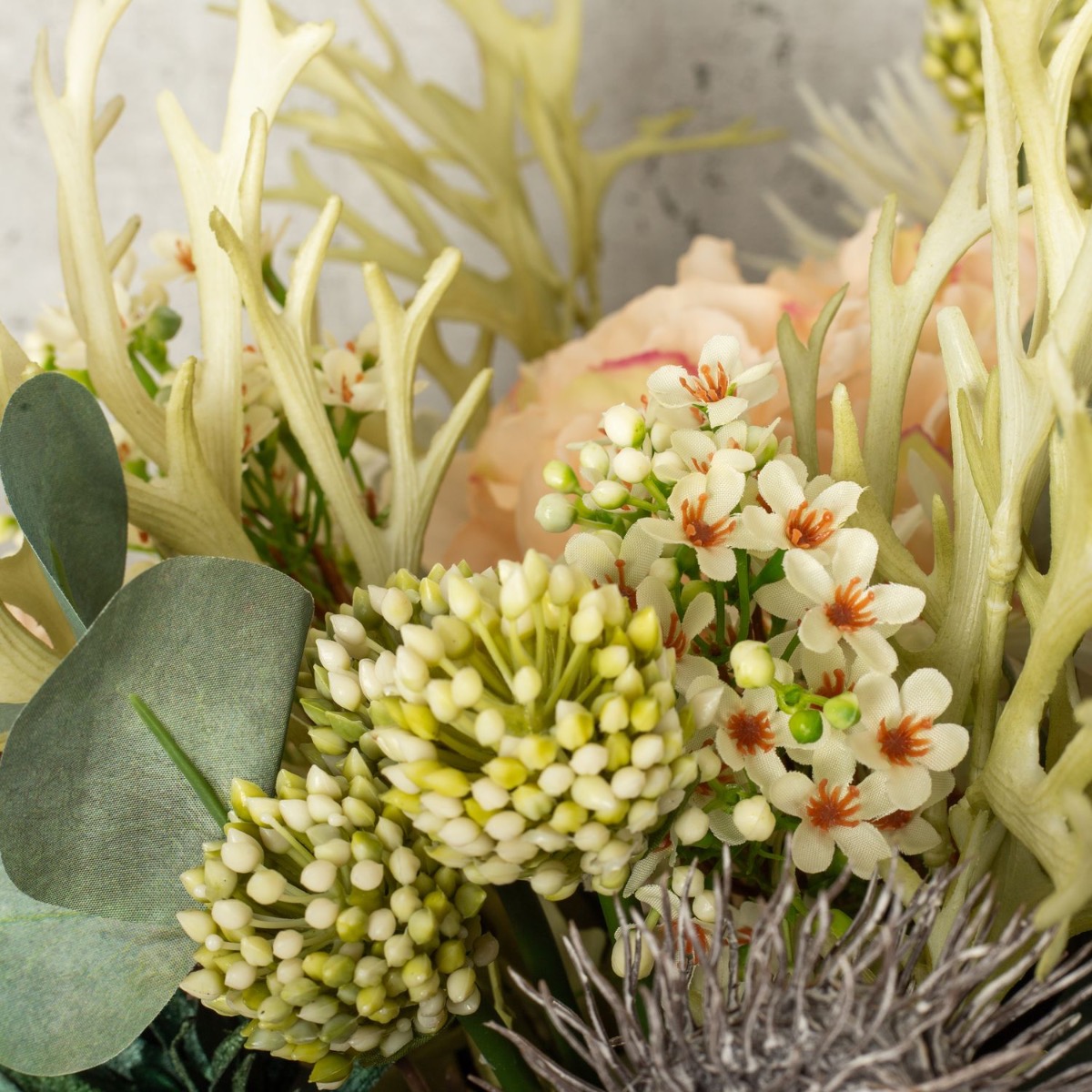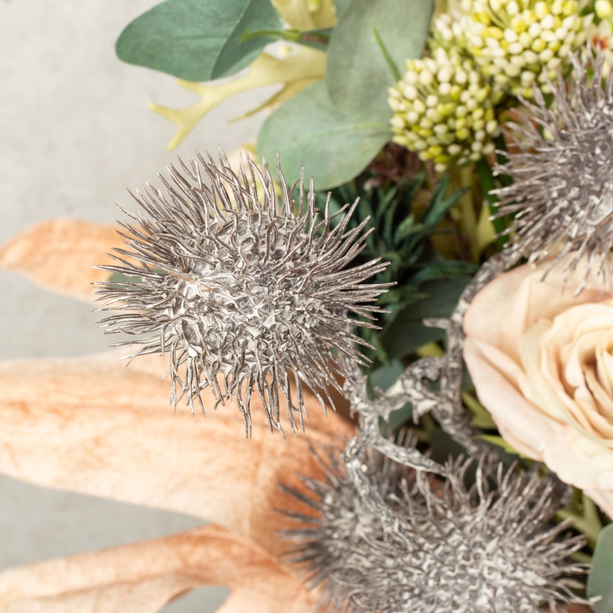 Rosa e verde eucalipto! Questo bouquet da sogno è un vero e proprio colpo d'occhio. Le delicate rose, i vellutati crisantemi e il pungente rambutan sono incorniciati dalle vellutate foglie. Non vi stancherete di guardarli perché questo bouquet appare diverso da ogni angolazione, dato che abbiamo utilizzato molti fiori diversi. Una festa per gli occhi! Acquista il look!