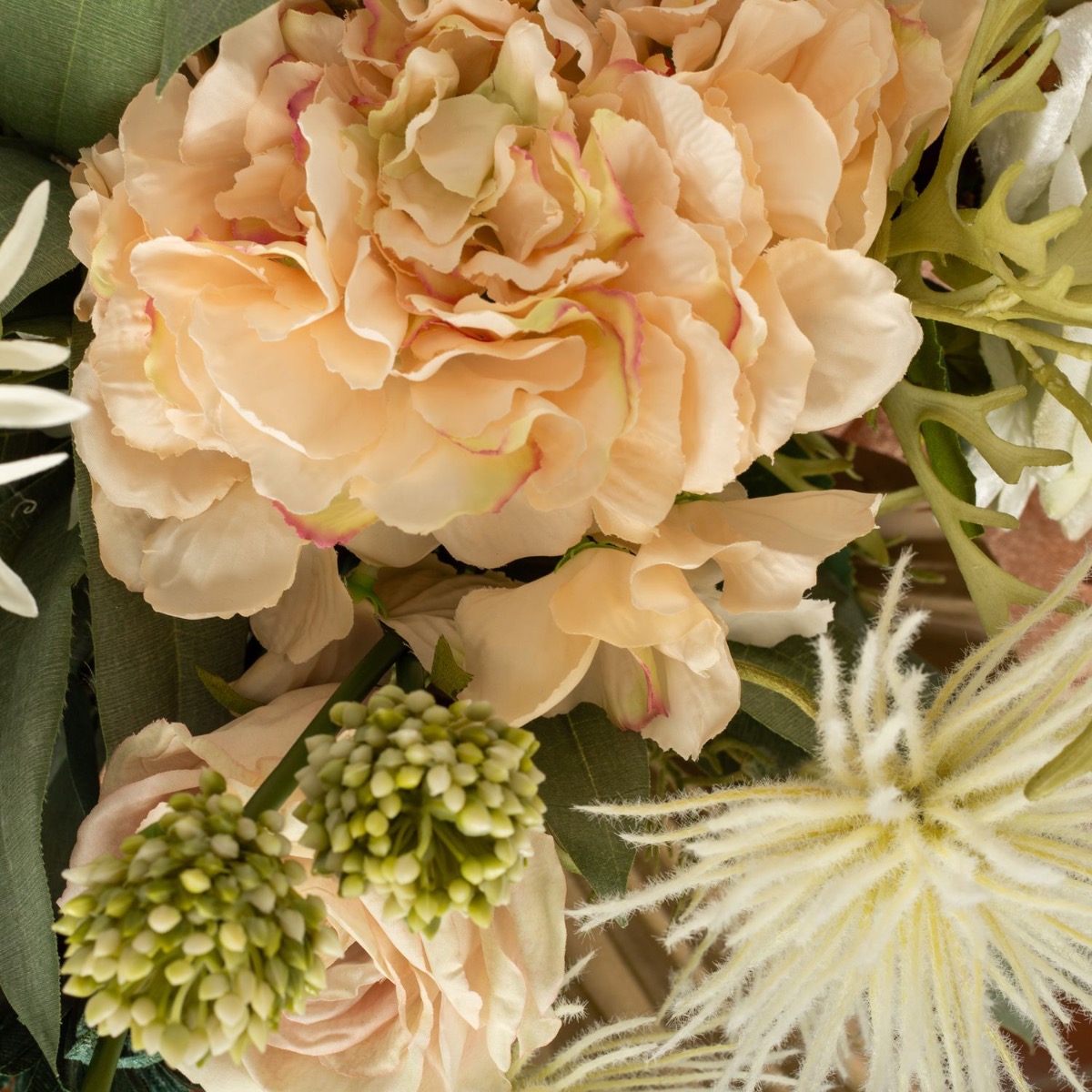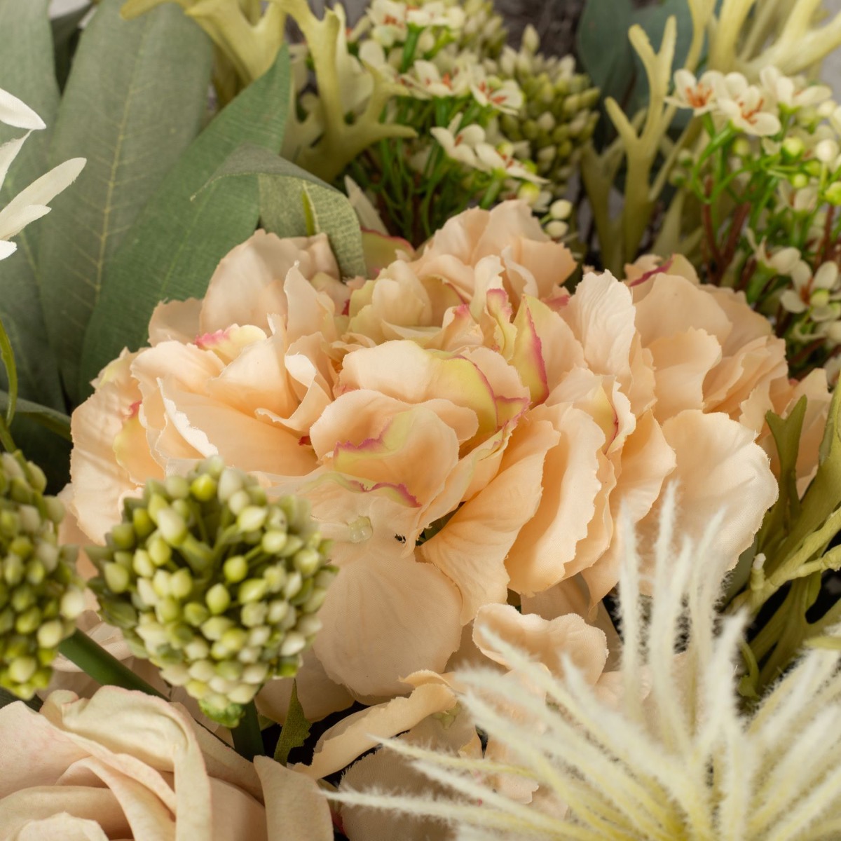 Consiglio per il design: Iniziate legando insieme i fiori per formare un bouquet. L'obiettivo è creare una forma rotonda e sferica, con l'ortensia al centro del bouquet. Le foglie vengono poi disposte alternativamente alla base del bouquet. In questo modo sembra che le foglie grandi sostengano il bouquet. Infine, gli steli vengono accorciati in base alle dimensioni del vaso.