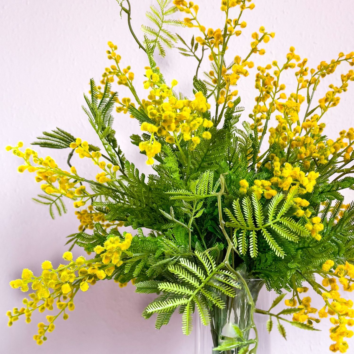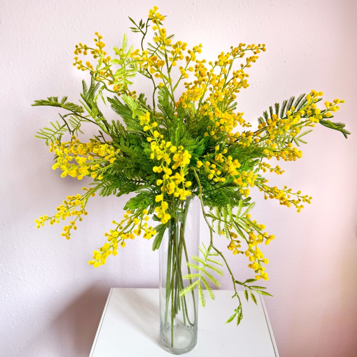 Un tocco di sole: la leggerezza della natura nella vostra casa! Questo bouquet di mimosa irradia pura leggerezza e gioia di vivere. Le foglie delicate e piumate di un verde fresco creano un contrasto armonioso con i fiori giallo brillante che sembrano piccoli raggi di sole. Disposta in un vaso di vetro alto e semplice, l'eleganza naturale della mimosa viene esaltata alla perfezione. Il bouquet appare fresco, vivace e delicato allo stesso tempo, ideale per dare un tocco allegro e solare a ogni ambiente. Un vero e proprio richiamo visivo che porta la primavera e il calore in casa. Acquista il look!
